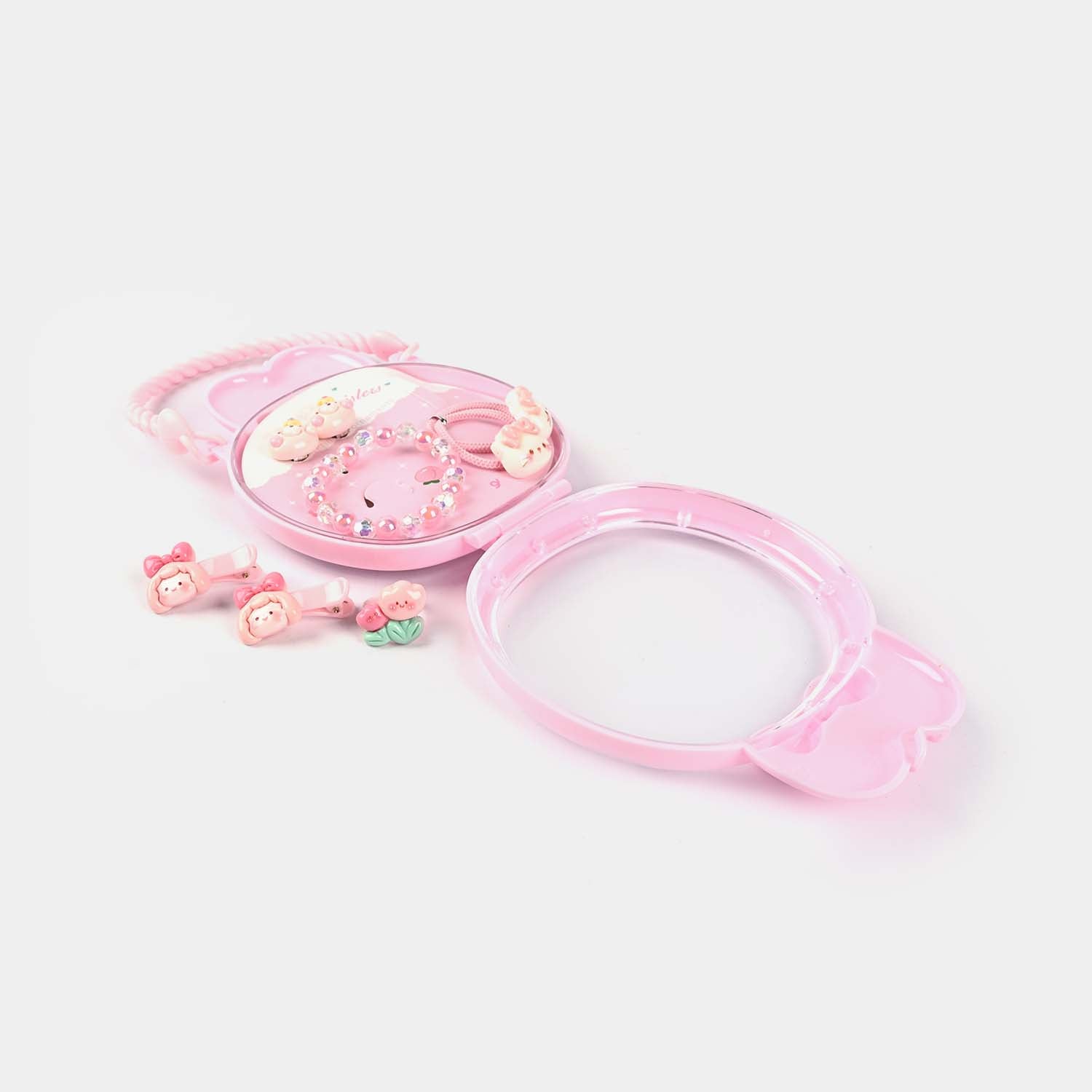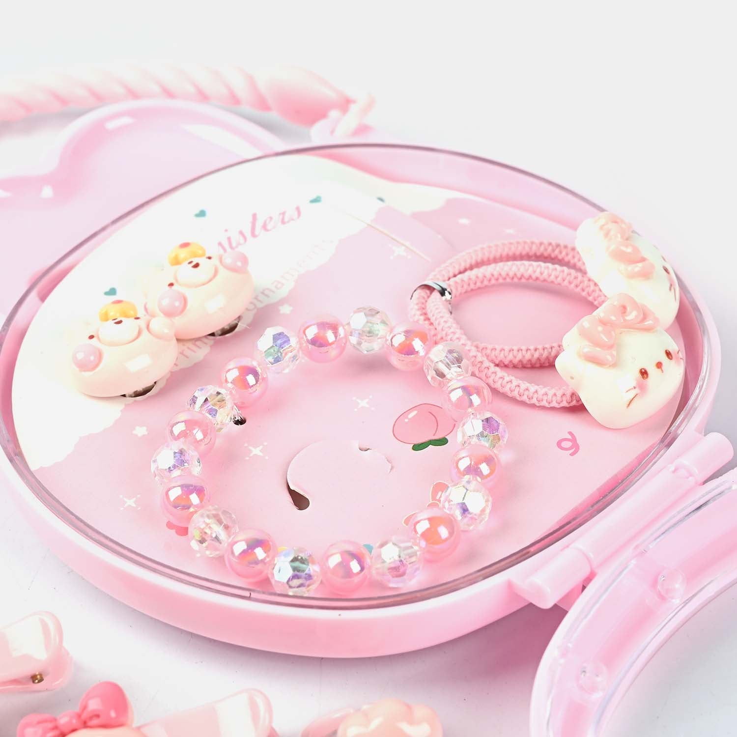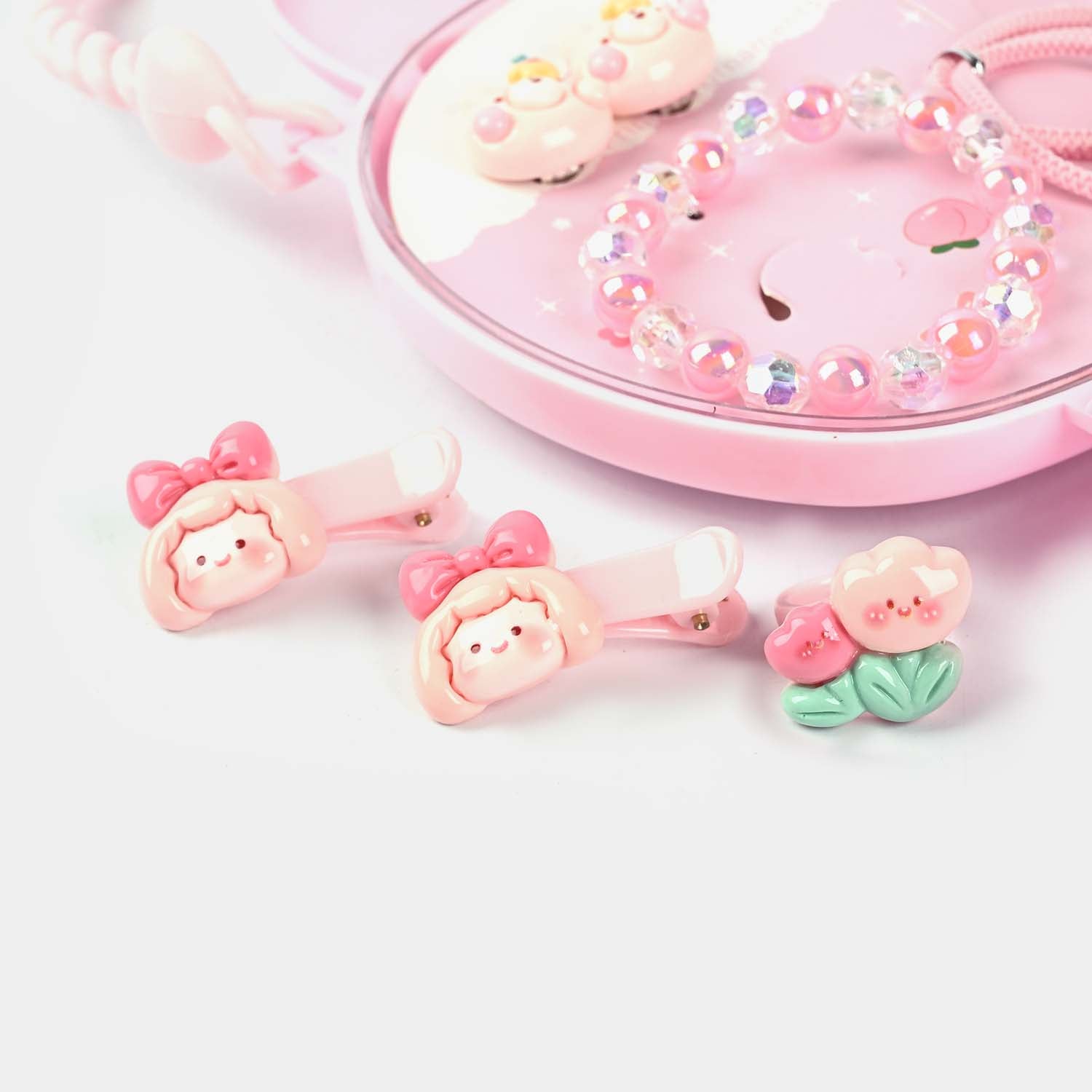 This cute and colorful gift set for girls is a delightful mix of accessories and jewelry, perfect for adding fun to any look! Packed in a charming bunny-shaped case with pearl details, it includes a variety of stylish essentials. A great gift for little princesses! 🎀✨
