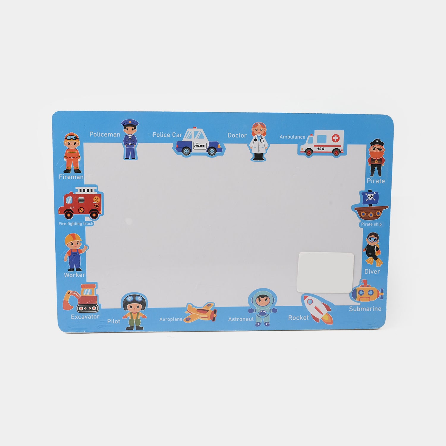 This high-quality wooden toy is perfect for encouraging creativity and hands-on learning. One side functions as a whiteboard for drawing or writing, while the other includes removable characters and a vehicle for imaginative play.
