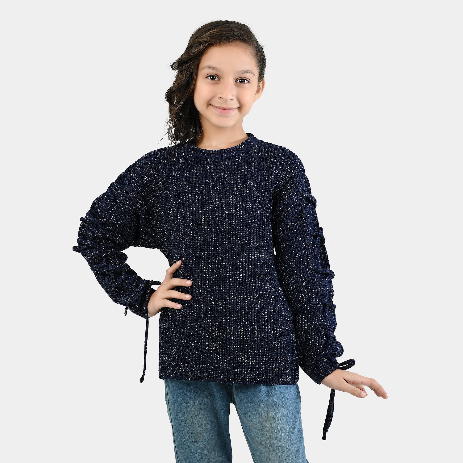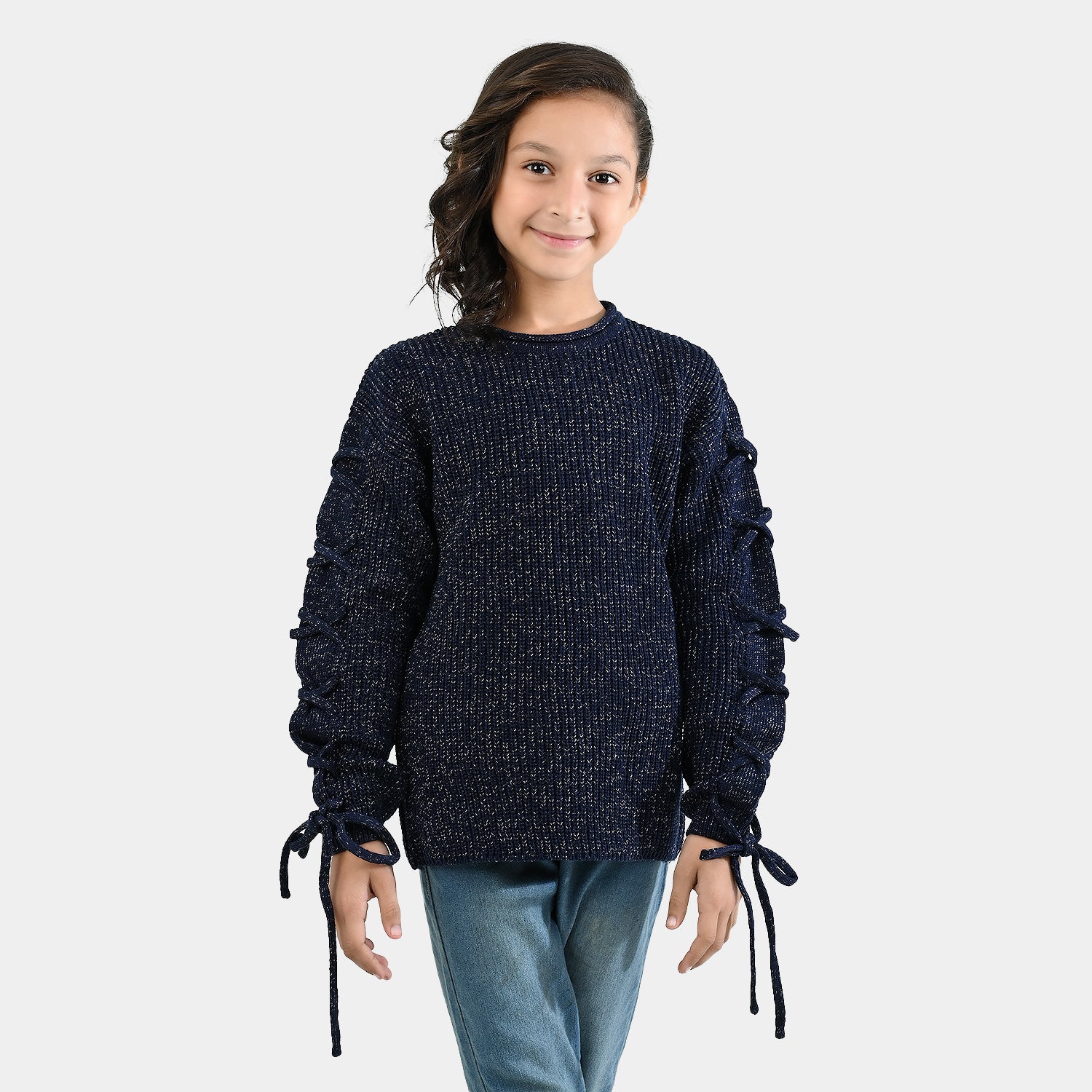 Chic and playful, this navy sweater is woven with lurex details and designed with stylish sleeve accents. A fashion-forward pick that keeps her cozy while making every outfit shine.