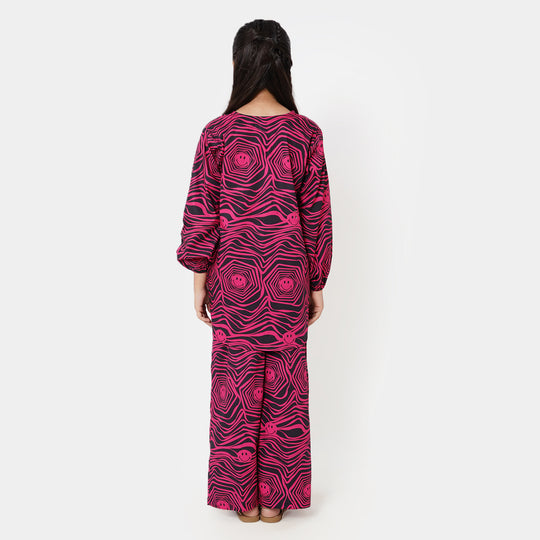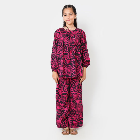 This vibrant magenta 2PC suit for girls' features a bold combination of colors that will make her stand out. Crafted from soft cotton, the shirt is designed with gathers and elasticated sleeves, while the snug-fit bottom features a flapper for superior comfort and an elevated look.
