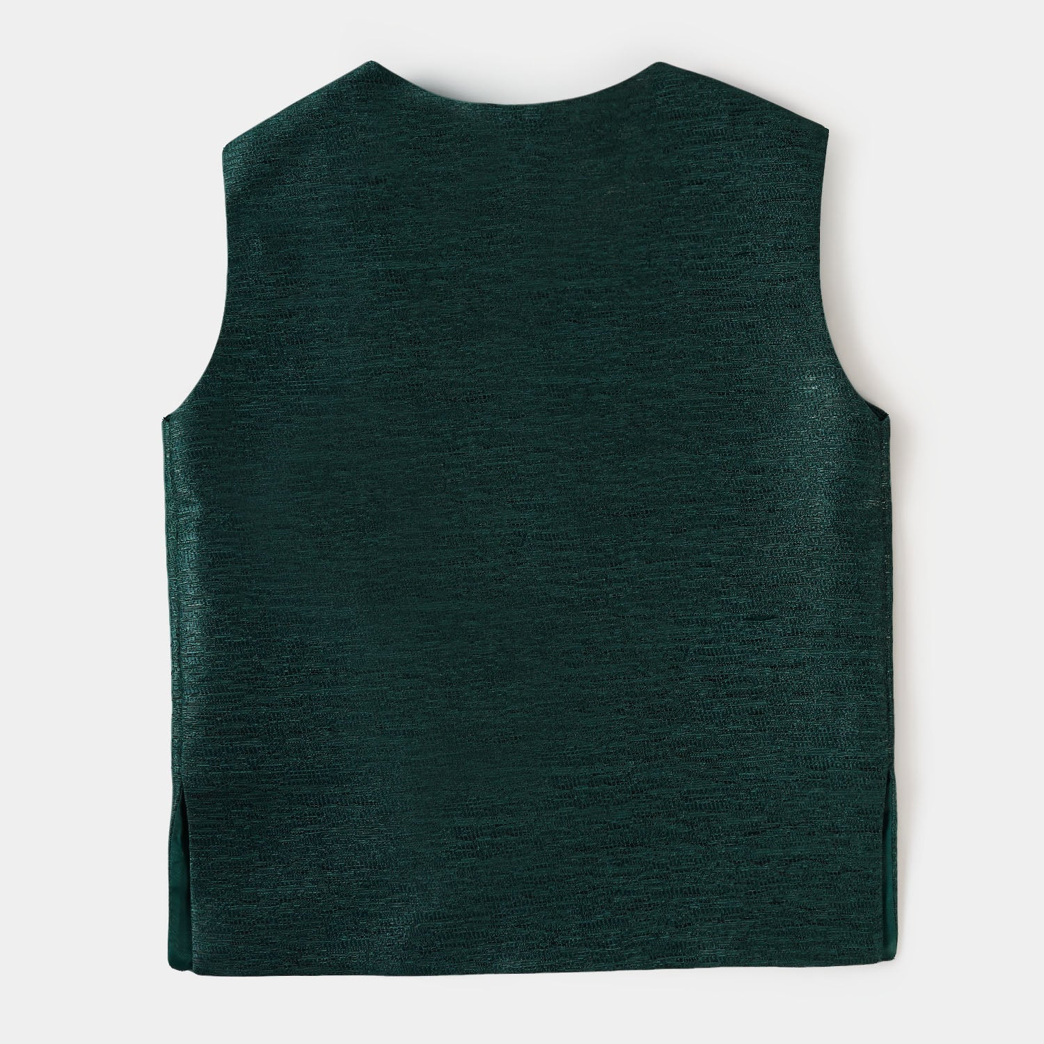The accompanying dark green jacquard waistcoat enhances the outfit's charm. Adorned with the symbolic Chand Sitara theme, it beautifully ties tradition with sophistication. The golden buttons and embroidered Chand on the pocket add a dash of regality, making the outfit stand out.