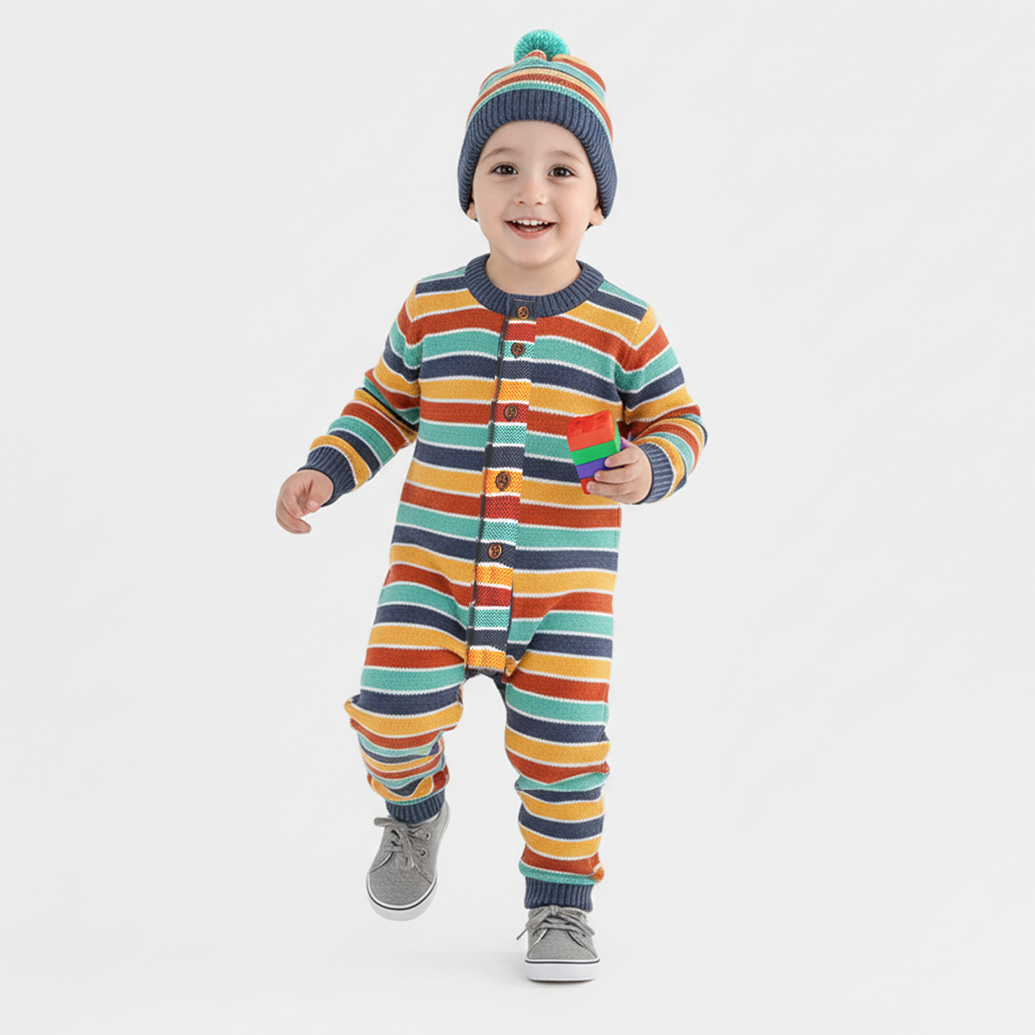 Cuteness overloaded! This vibrant striped romper paired with a matching cap envelopes playful colors, and cozy warmth in one adorable outfit.