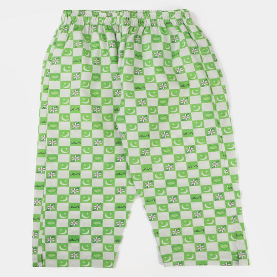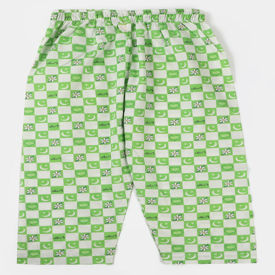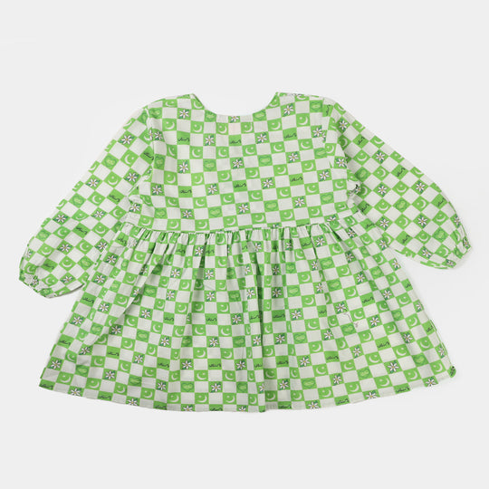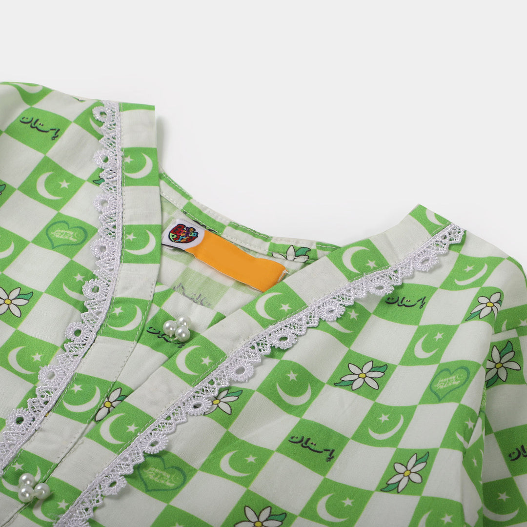 Add a splash of patriotism to your wardrobe this Independence Day with this cute Infant Girls Cotton Co-ord Set. Designed to commemorate the spirit of Pakistan, this Chand- Sitara coordinated frock style kameez and trouser is featuring a summer-friendly cotton-poplin and a unique print. Each piece from our collection tells a story, evoking a sense of pride and unity that will resonate with every Pakistani.