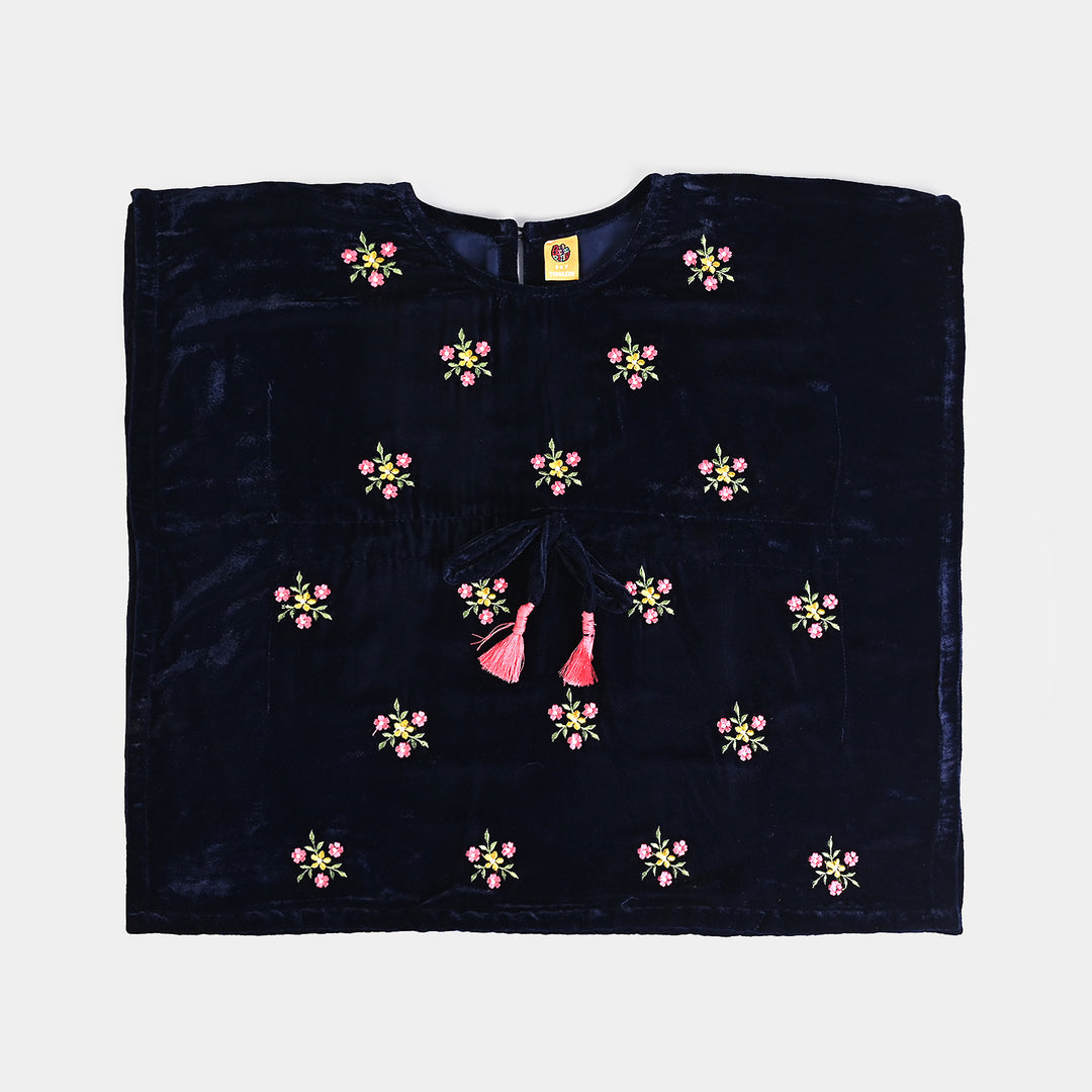 Girls Velvet Emb Top Flowers Bouquet-Navy Blue