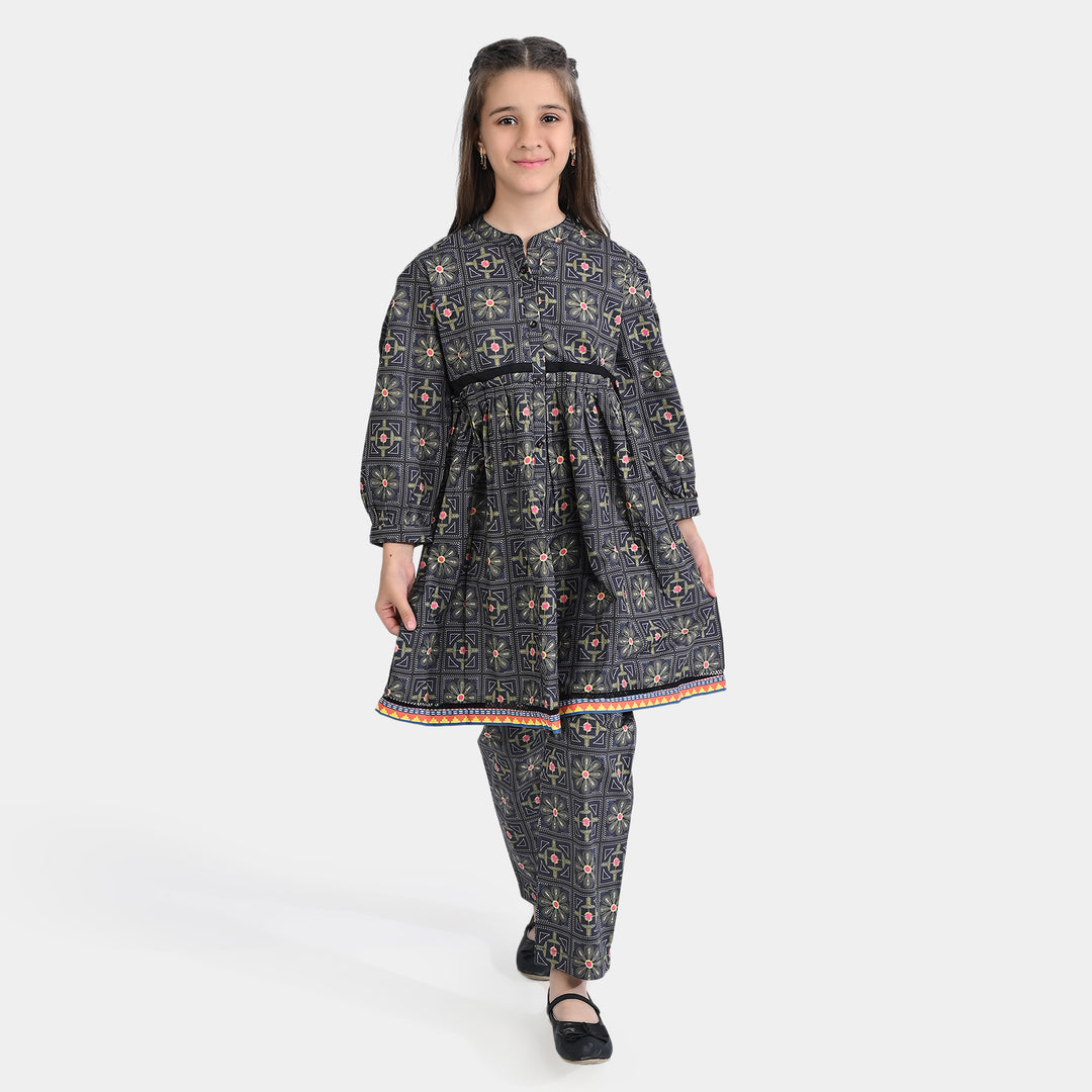 Girls Cotton Poplin Printed 2 PCs Suit Kantha-BLACK