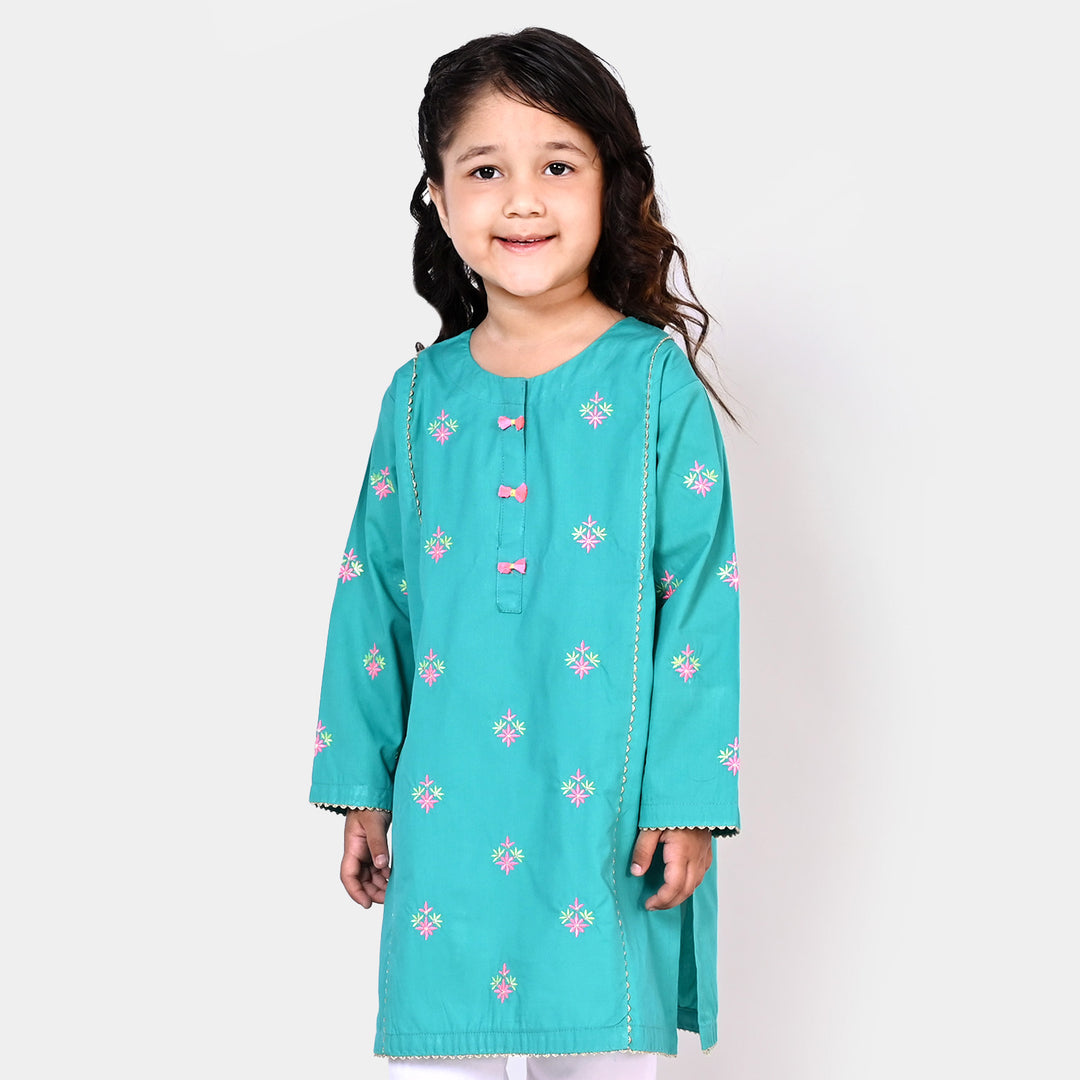 Girls Cotton EMB Kurti Flower Gate - Aqua Green