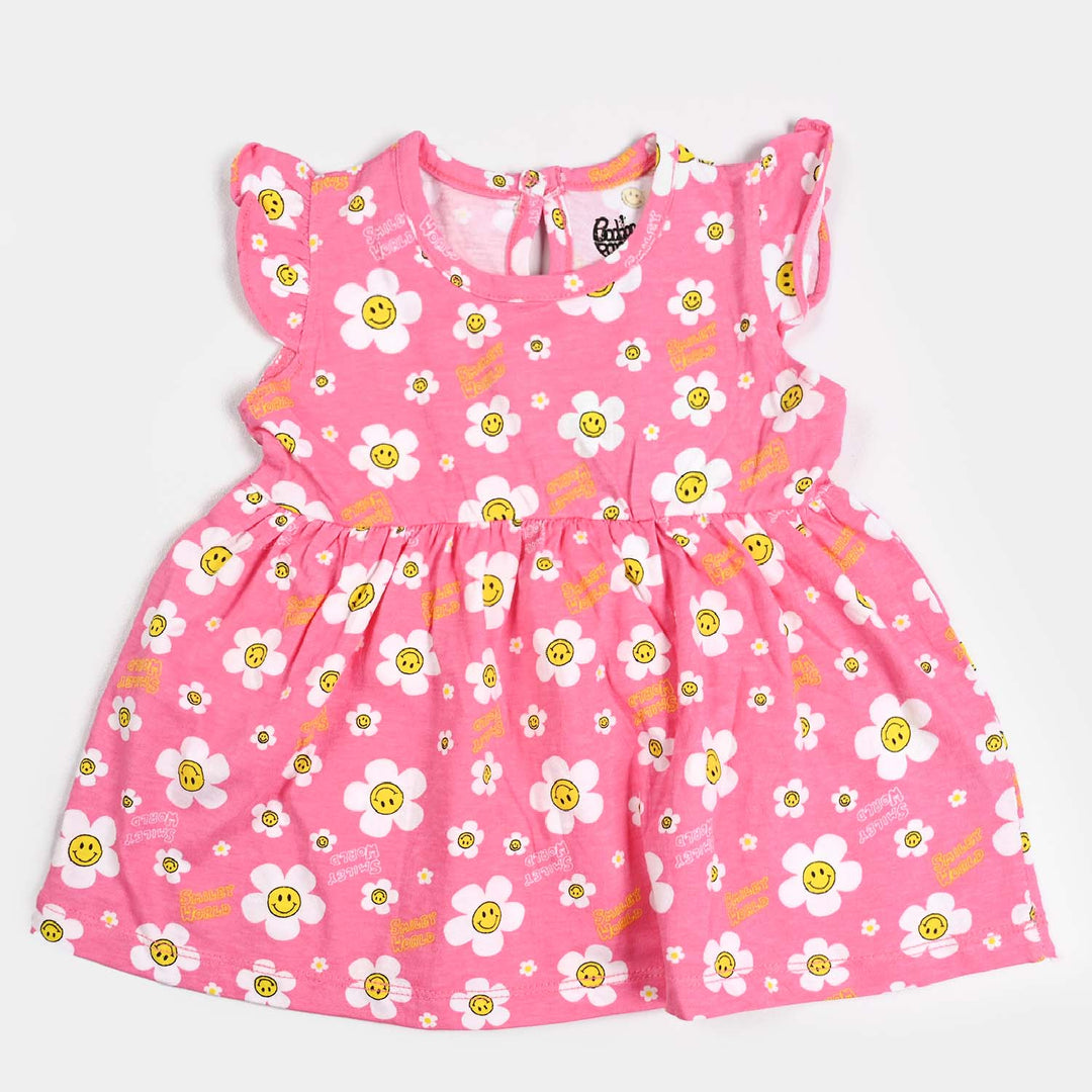 Infant Girls Cotton Terry Knitted Frock Smiley Flowers-Pink