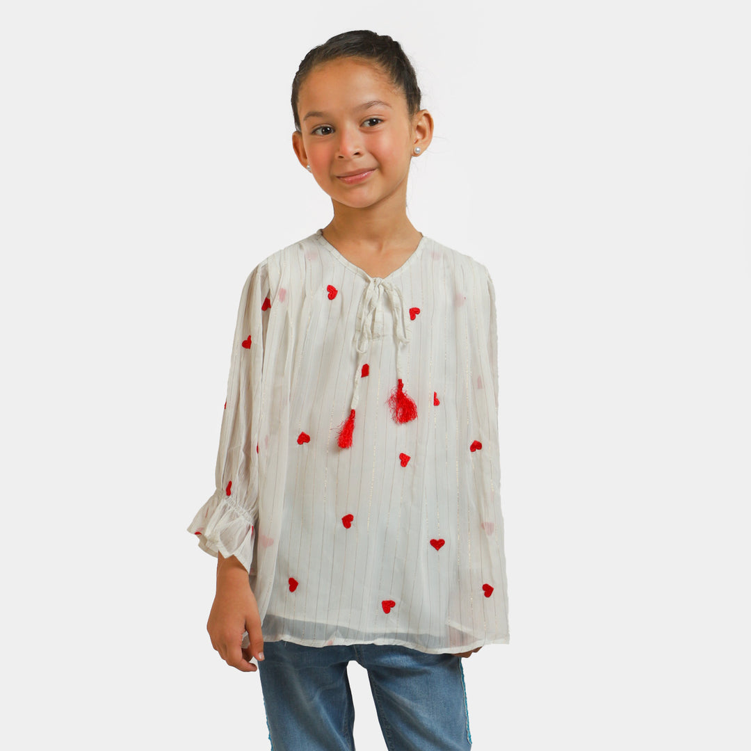 Girls Chiffon Embroidered Top Red Hearts - White