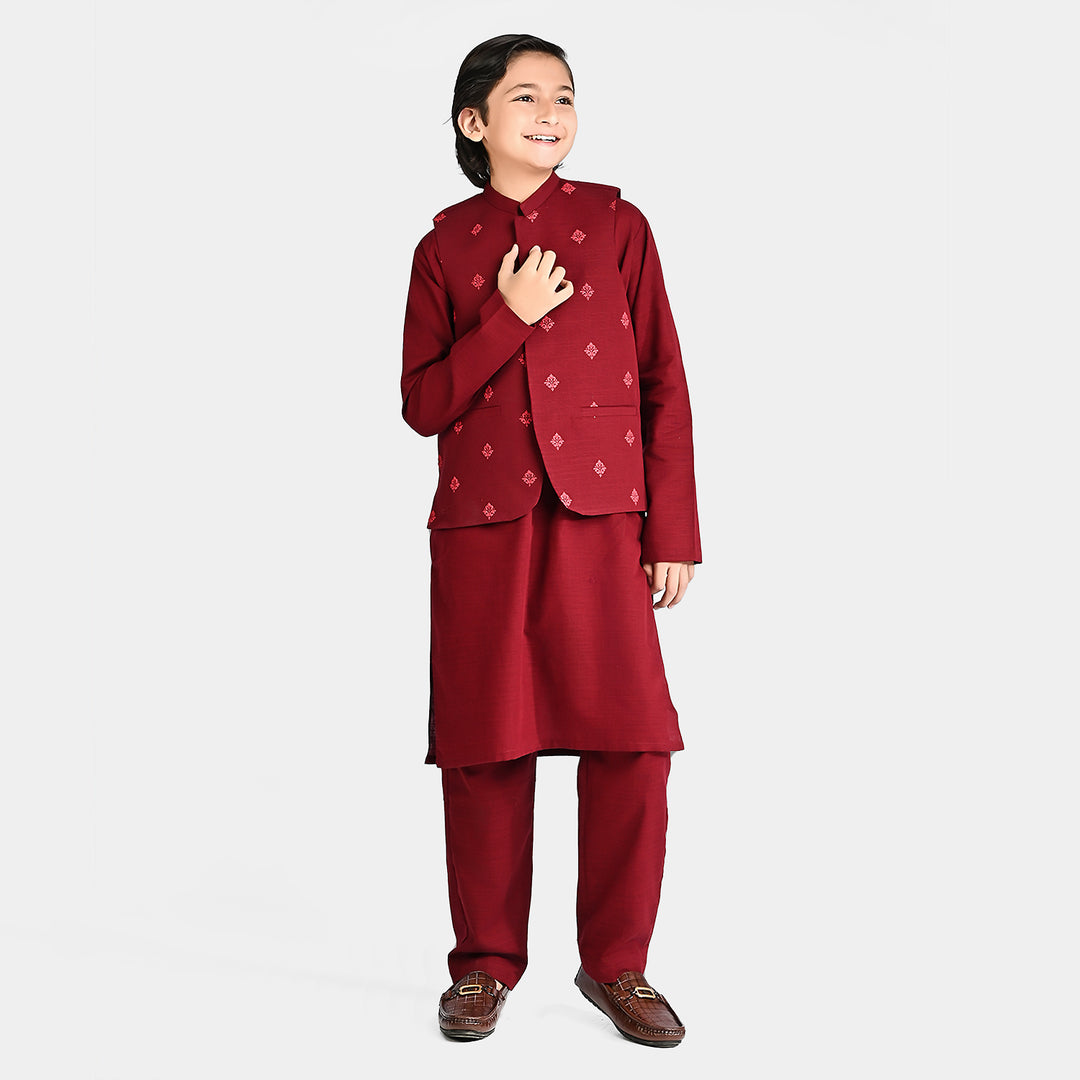 Boys Cotton Slub 3 Piece Suit (Tone On Tone)-MAROON