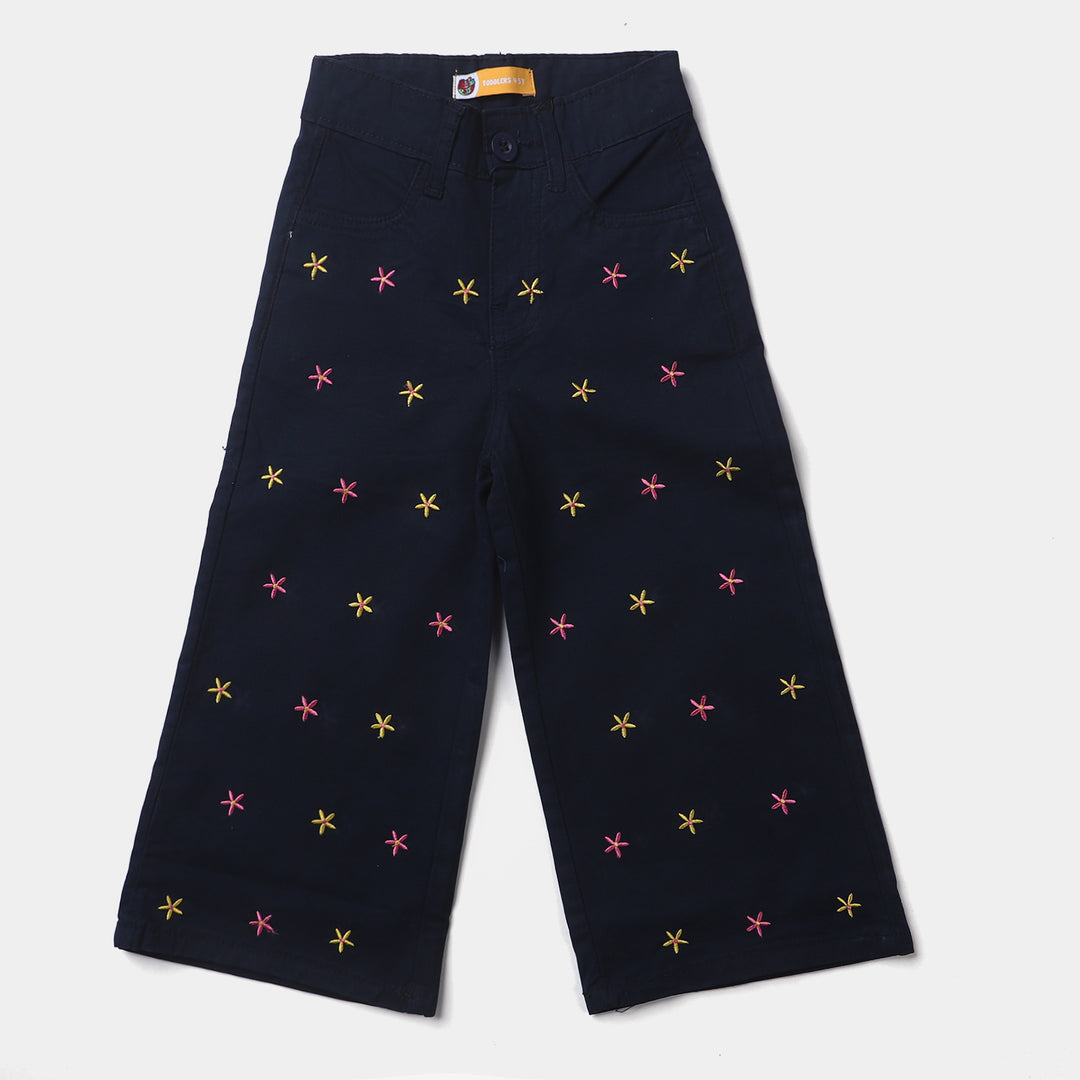 Girls Denim Stretch Pant Floral Embroidery-Navy Blue