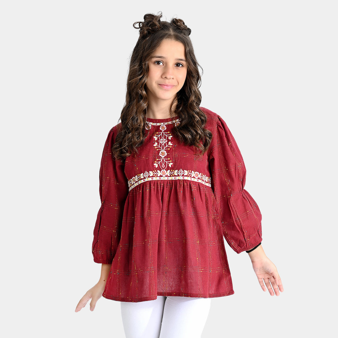 Girls Poly Cotton Emb Top Floral Neck-MAROON