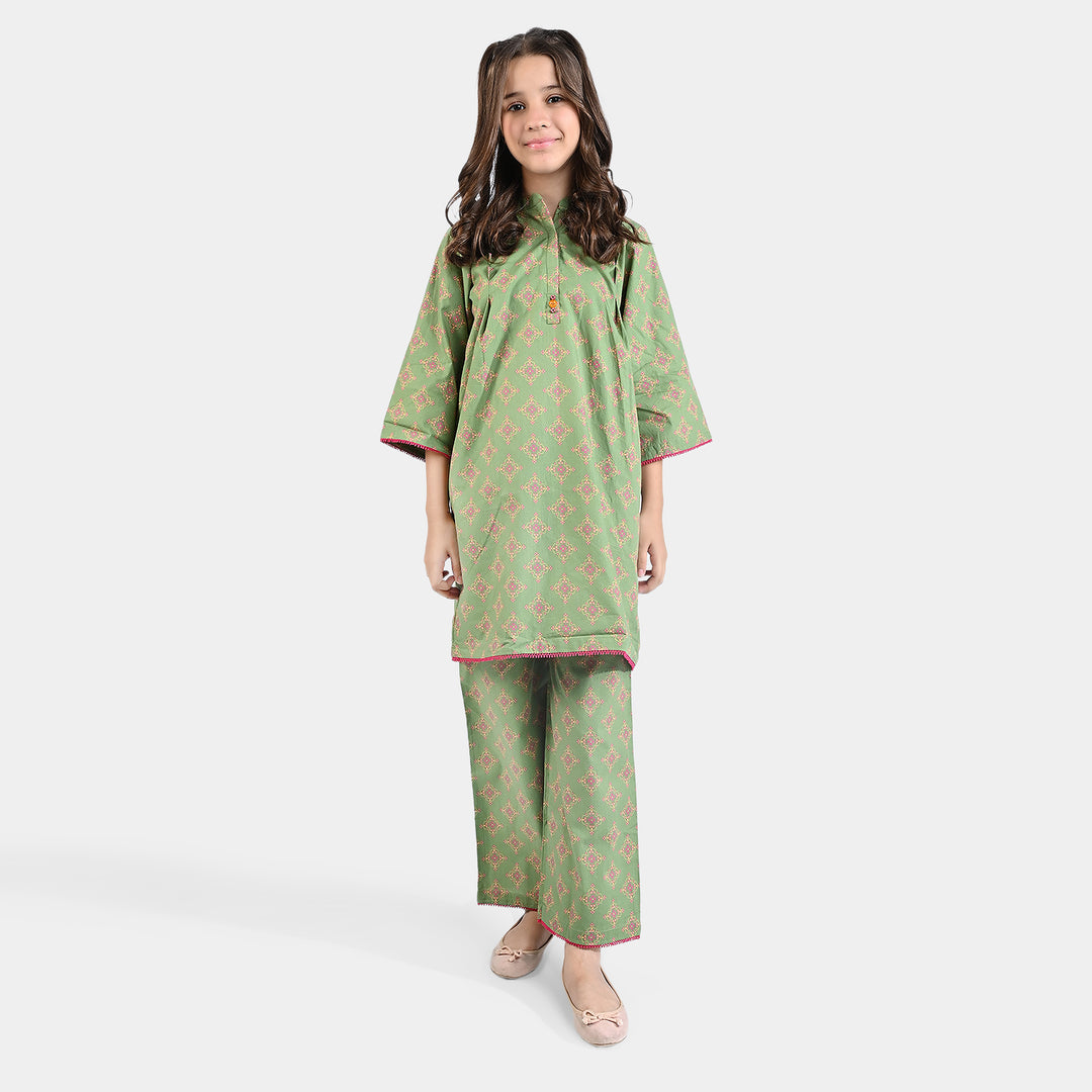 Girls Cotton Poplin Printed 2PC Suit Phulkari-Green
