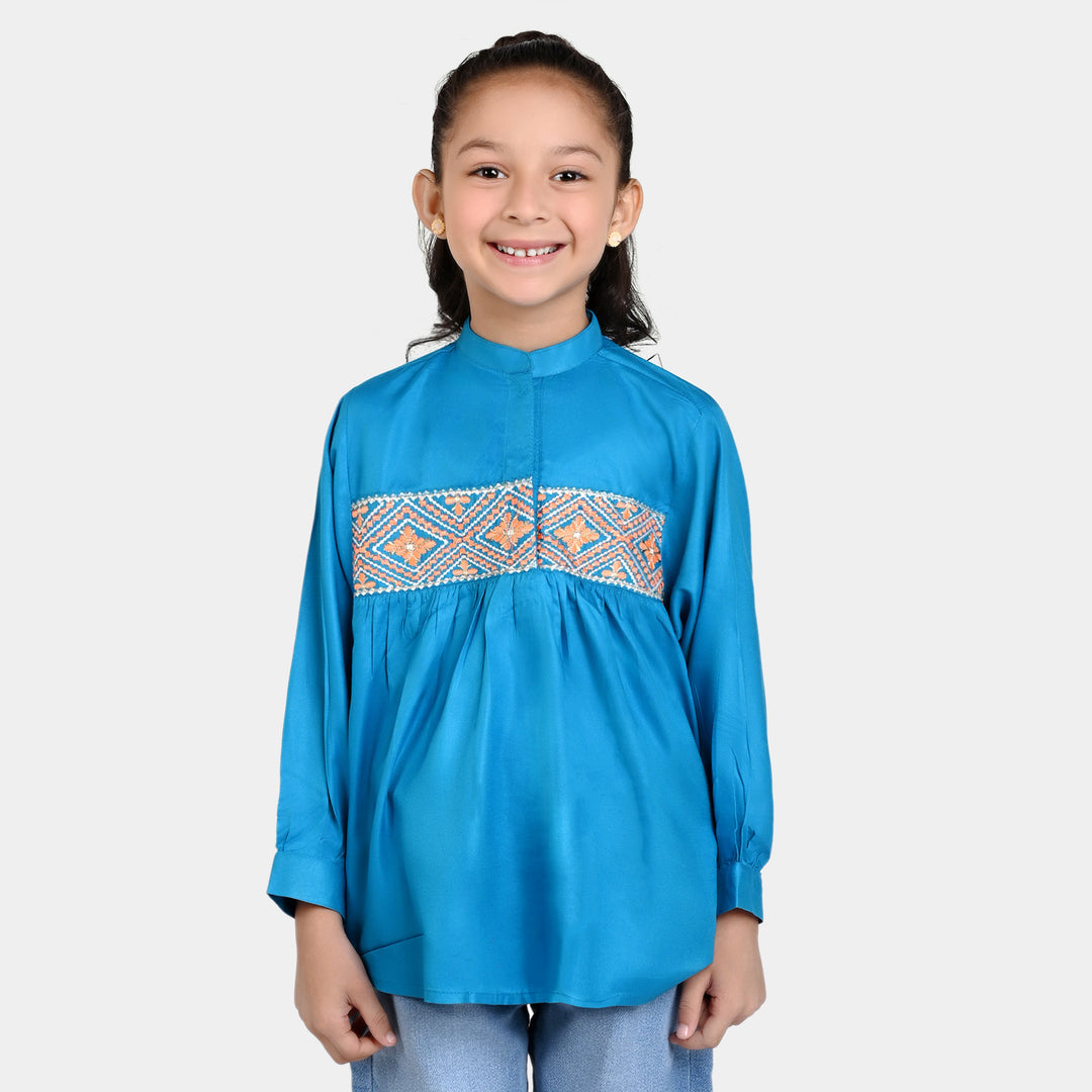 Girls Embroidered Poly Viscose Top Aztec Effect-Blue