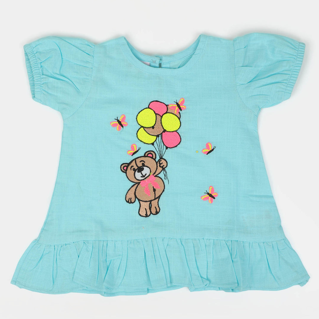 Infant Girls Cotton Kurti Emb Teddy Bear | Light Blue