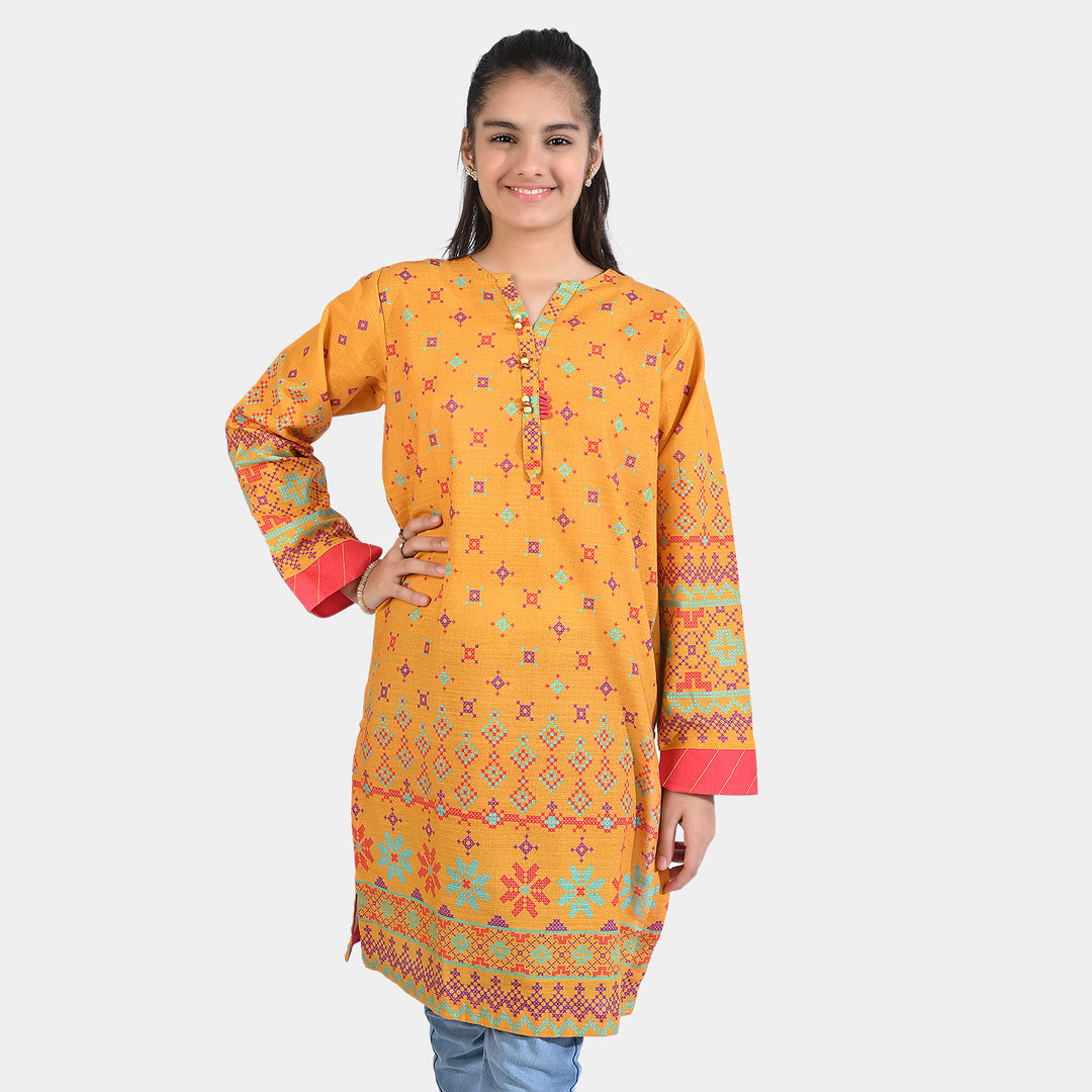 Teens Girls Cotton Slub Printed Kurti Kali-Mustard