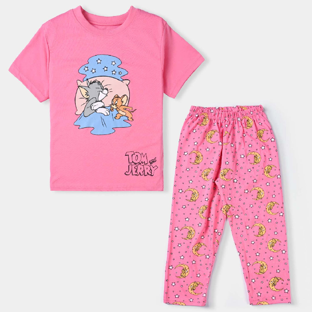 Girls Poly Cotton Jersey Knitted Night Suit-Hot Pink