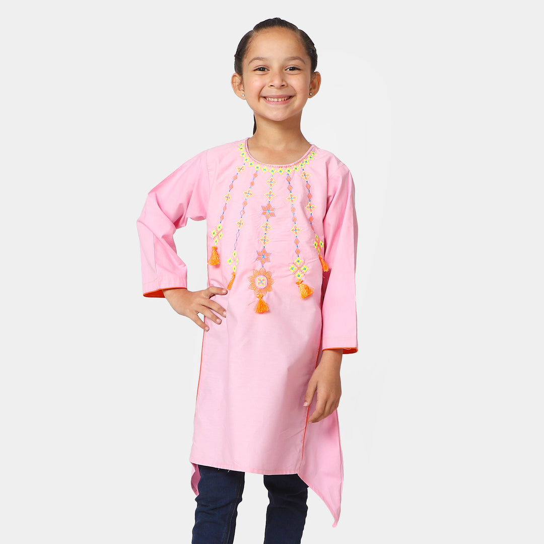 Girls Cotton Embroidered Kurti Artistic - Pink