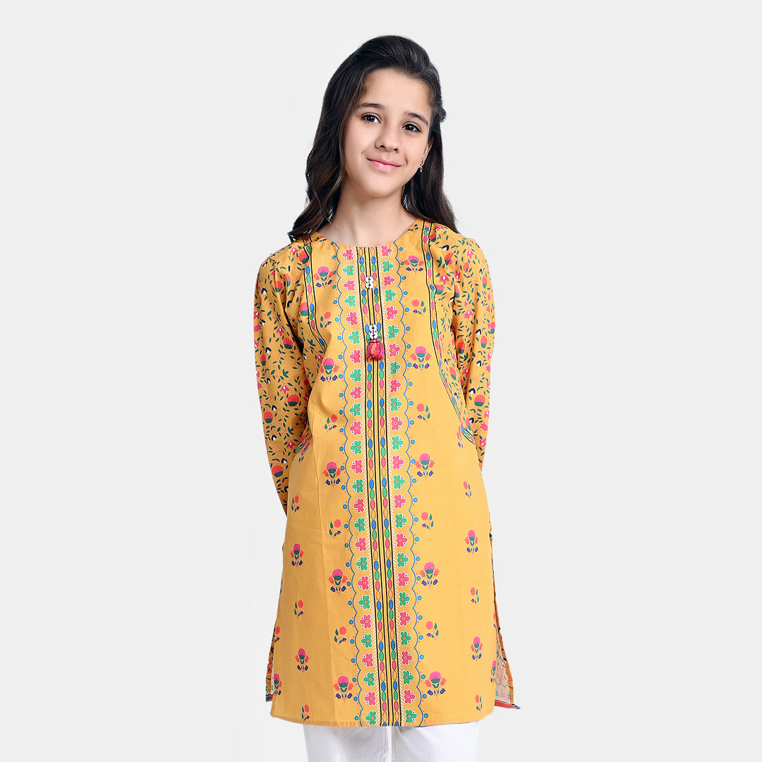 Girls Cotton Poplin Printed Kurti Laddu Peel-Mustard
