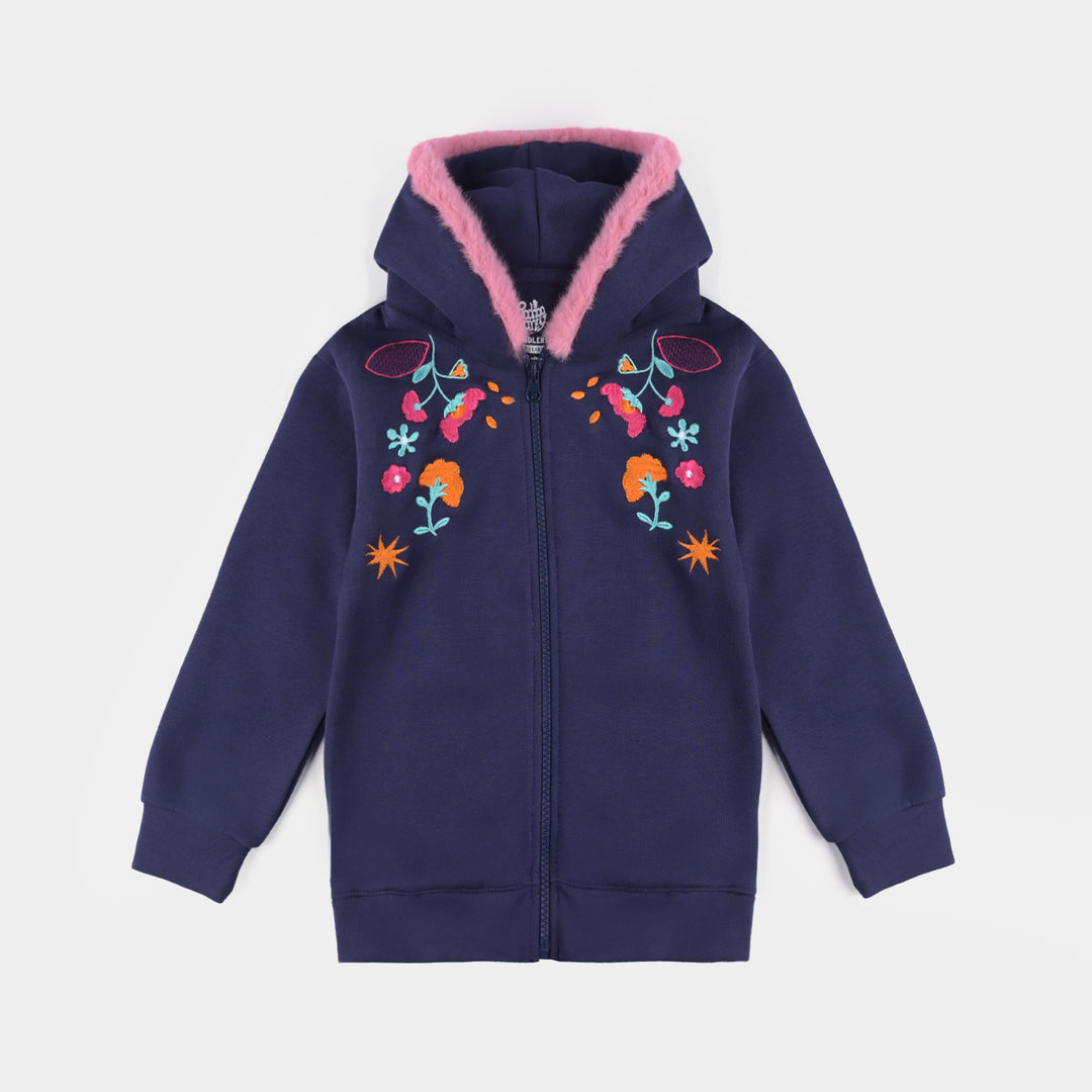 Girls Fleece Knitted Jacket Flowers-Navy Blue