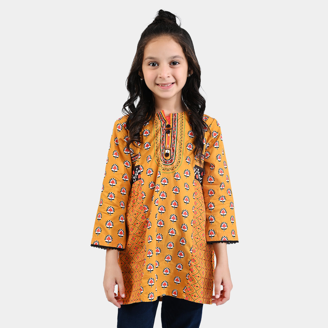 Girls Cotton Poplin Printed Kurti Olivia-Mustard
