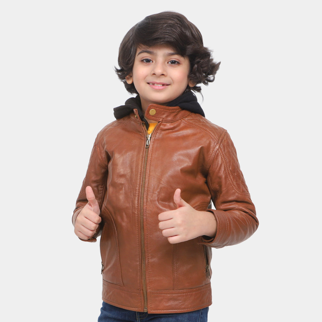 Boys Hooded Genuine Sheep Leather Jacket - Brown