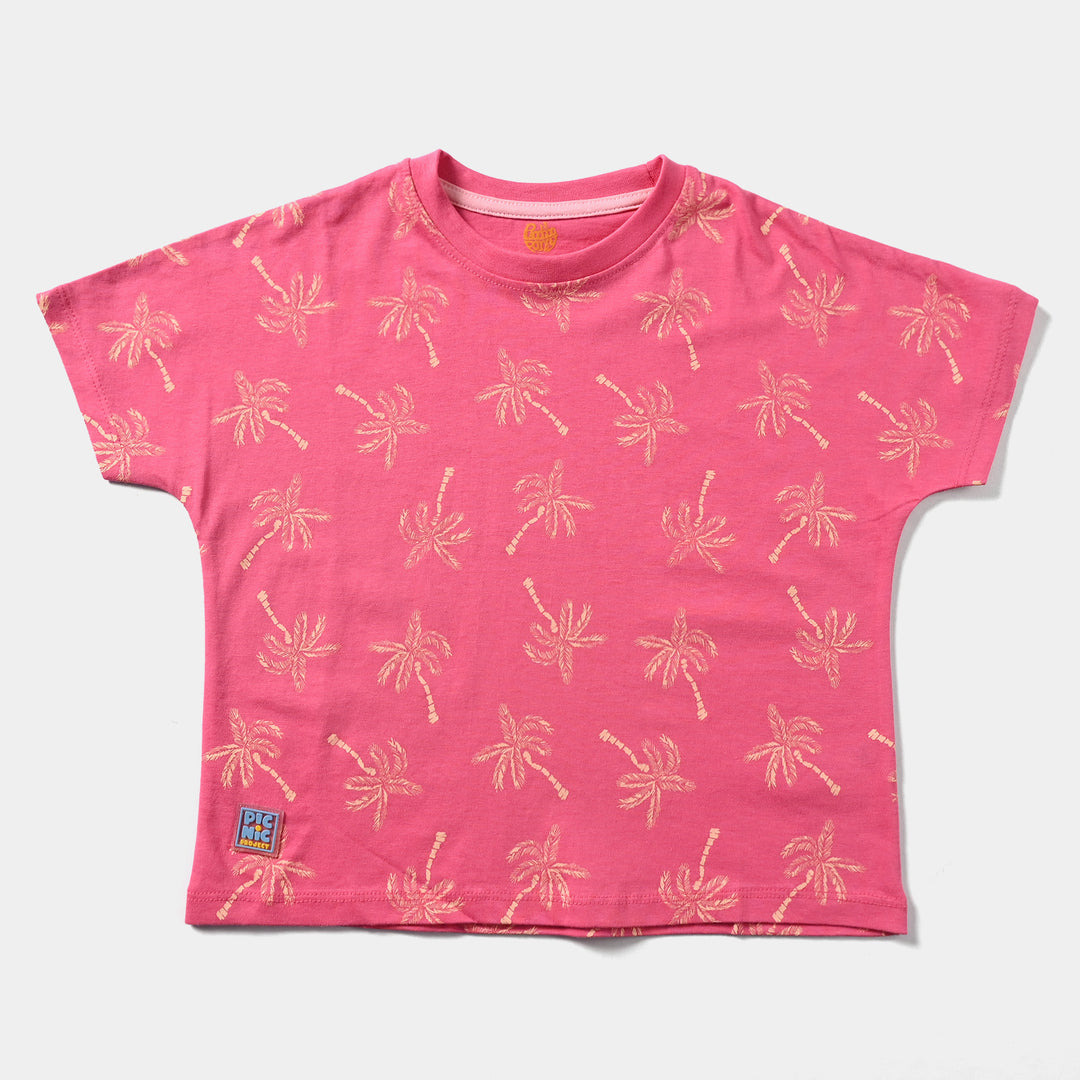 Girls Cotton Jersey T-Shirt H/S Palm Trees-Hot Pink
