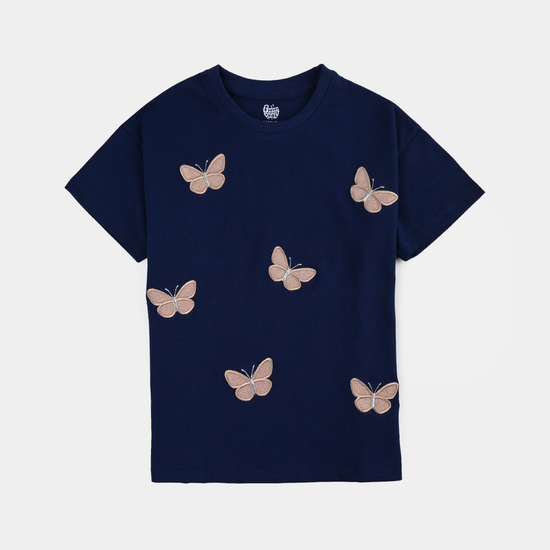 Girls Cotton Jersey T-Shirt H/S Butterflies-Navy Blue