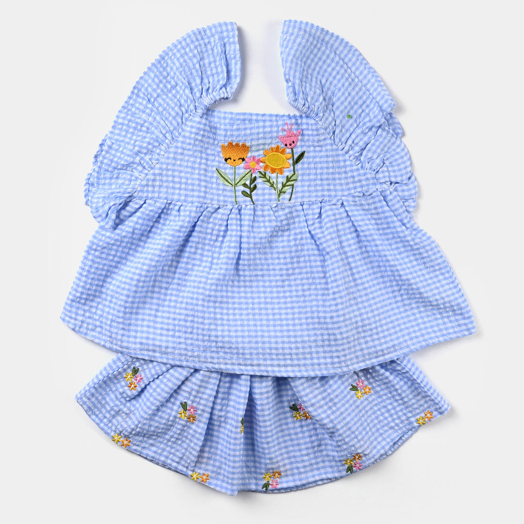 Infant Girls Poly Cotton Flower EMB 2PC Set -LT.Blue