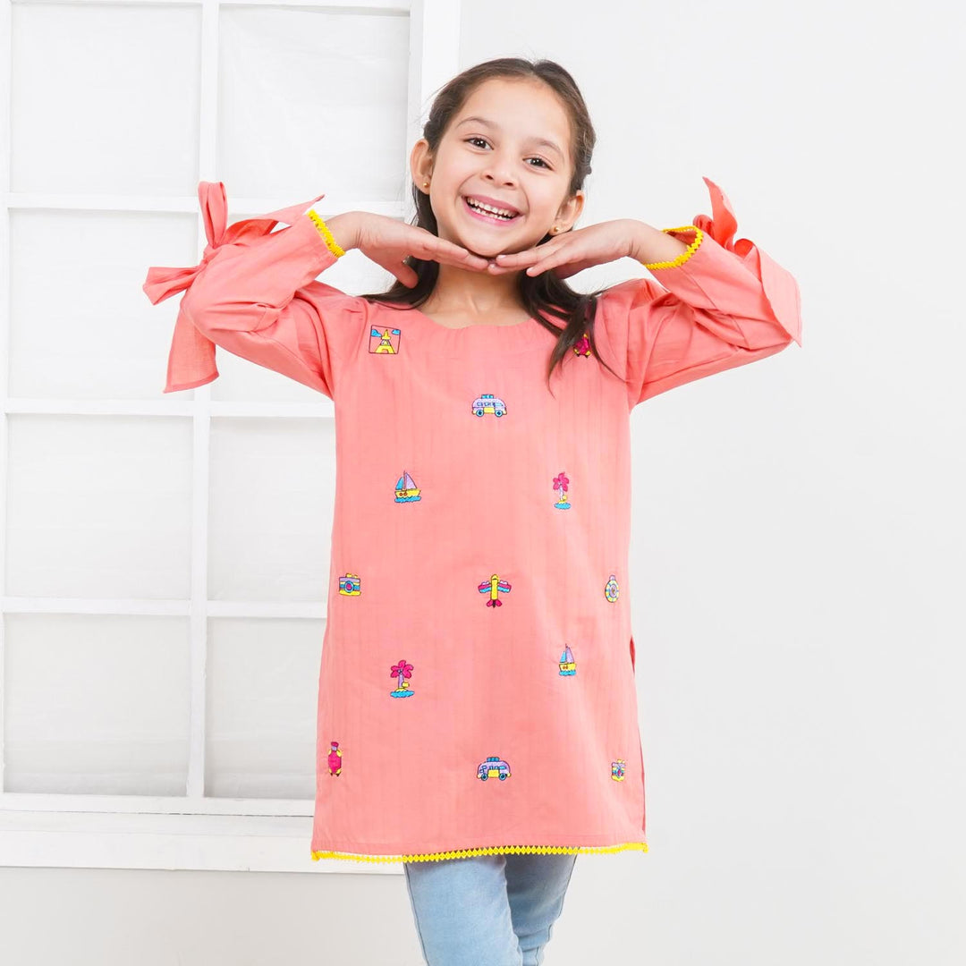 Girls Jacquard EMB Kurti Traveling Vibes - Peach