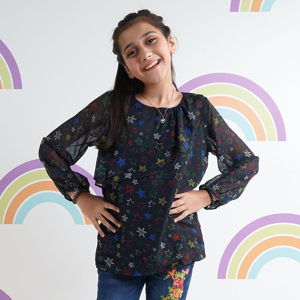 Girls Poly Net Printed 2Pcs Color Blocks Ind-Multi