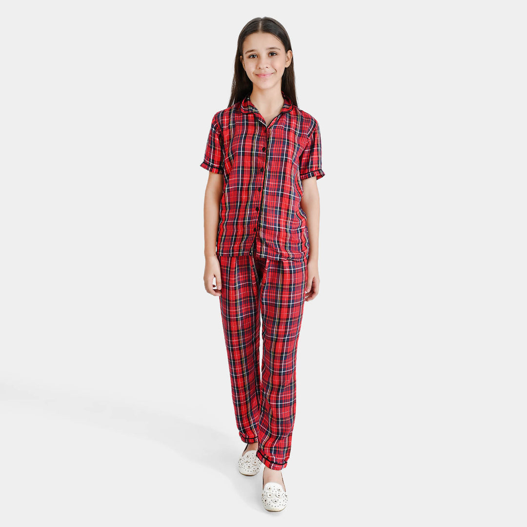 Girls Poly Cotton Woven Night Suit Red Check
