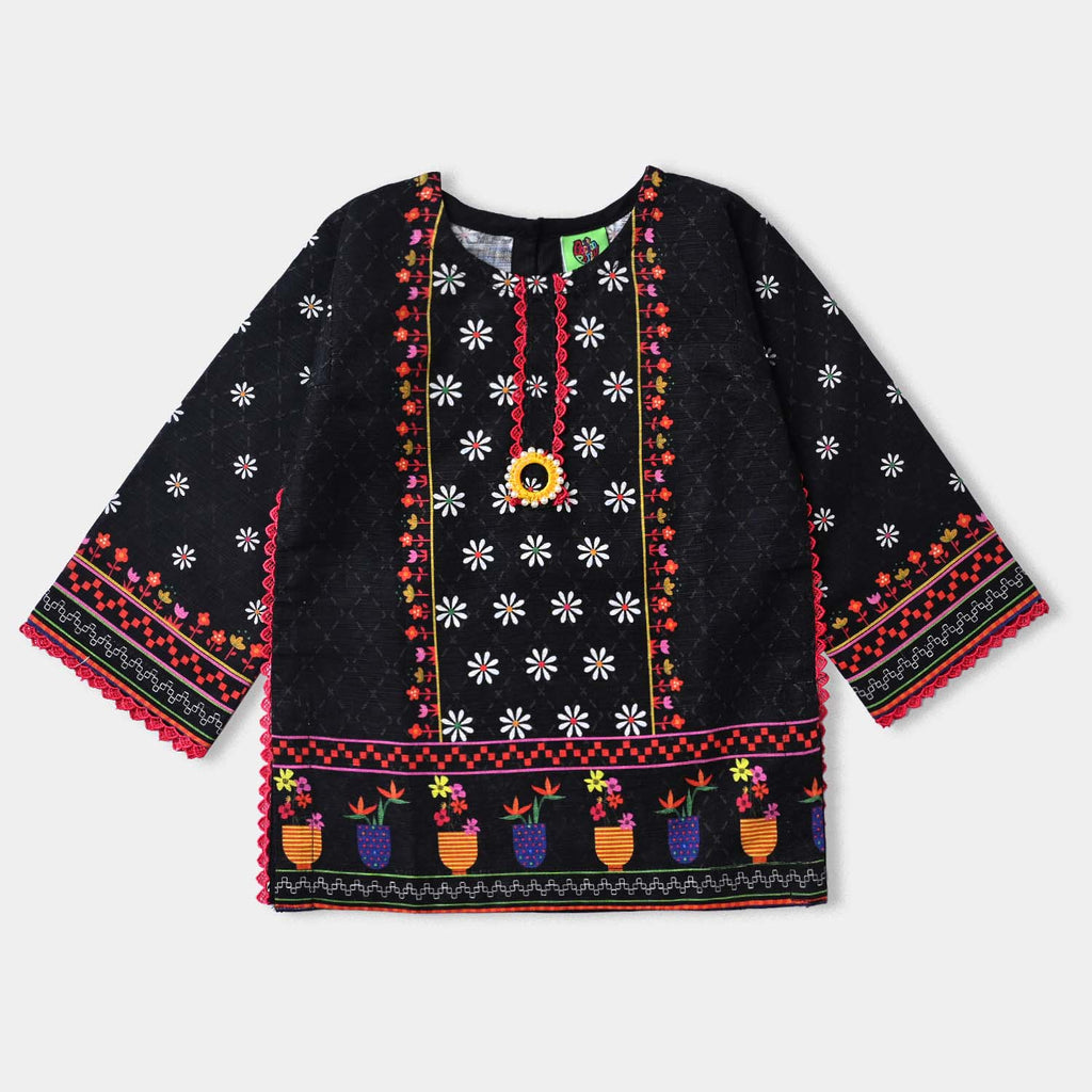 Infant Girls Cotton Slub Printed Kurti Floral Pot-BLACK