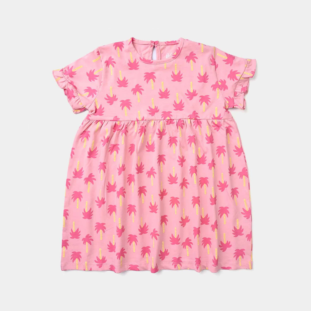 Girls Cotton Jersey Knitted Frock Palm Trees-Candy Pink