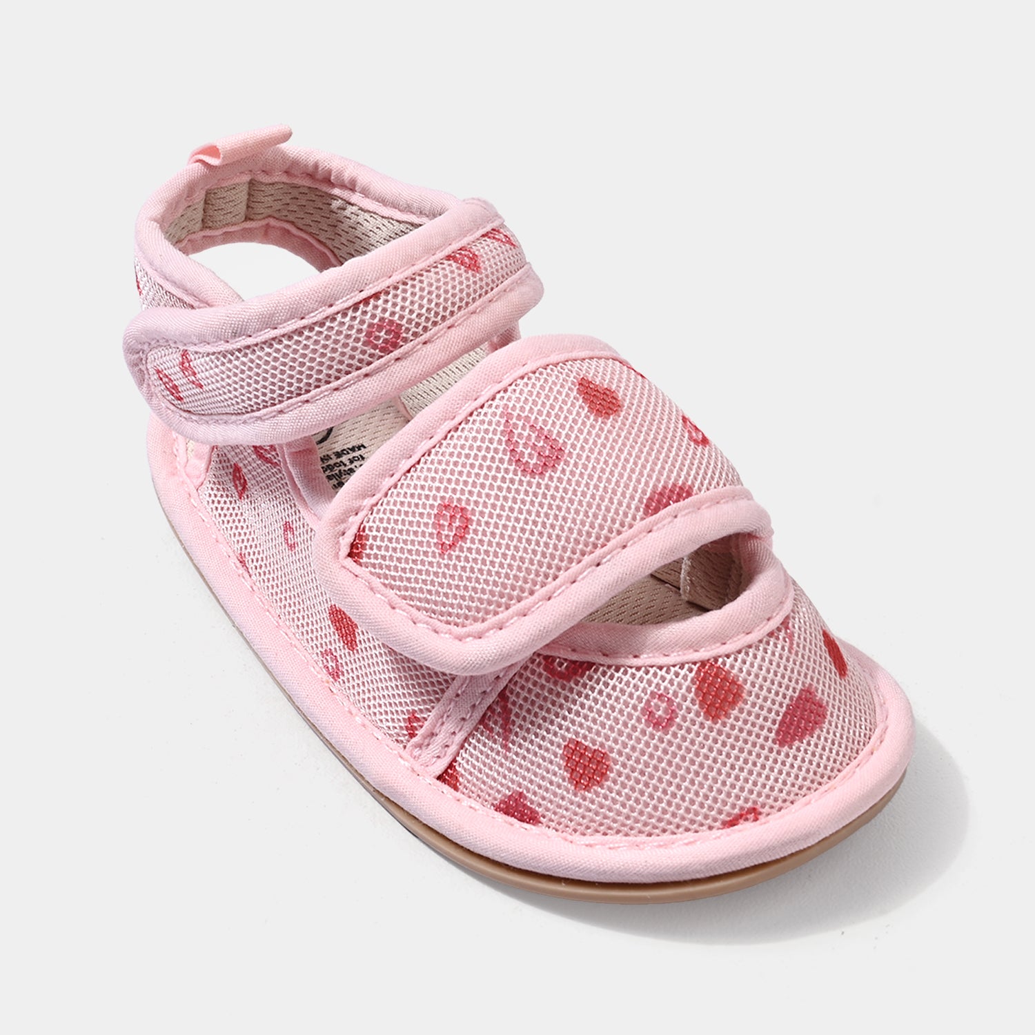 Infant girls’ pink shoes feature straps and a heart print, combining a secure fit with a playful, stylish design.