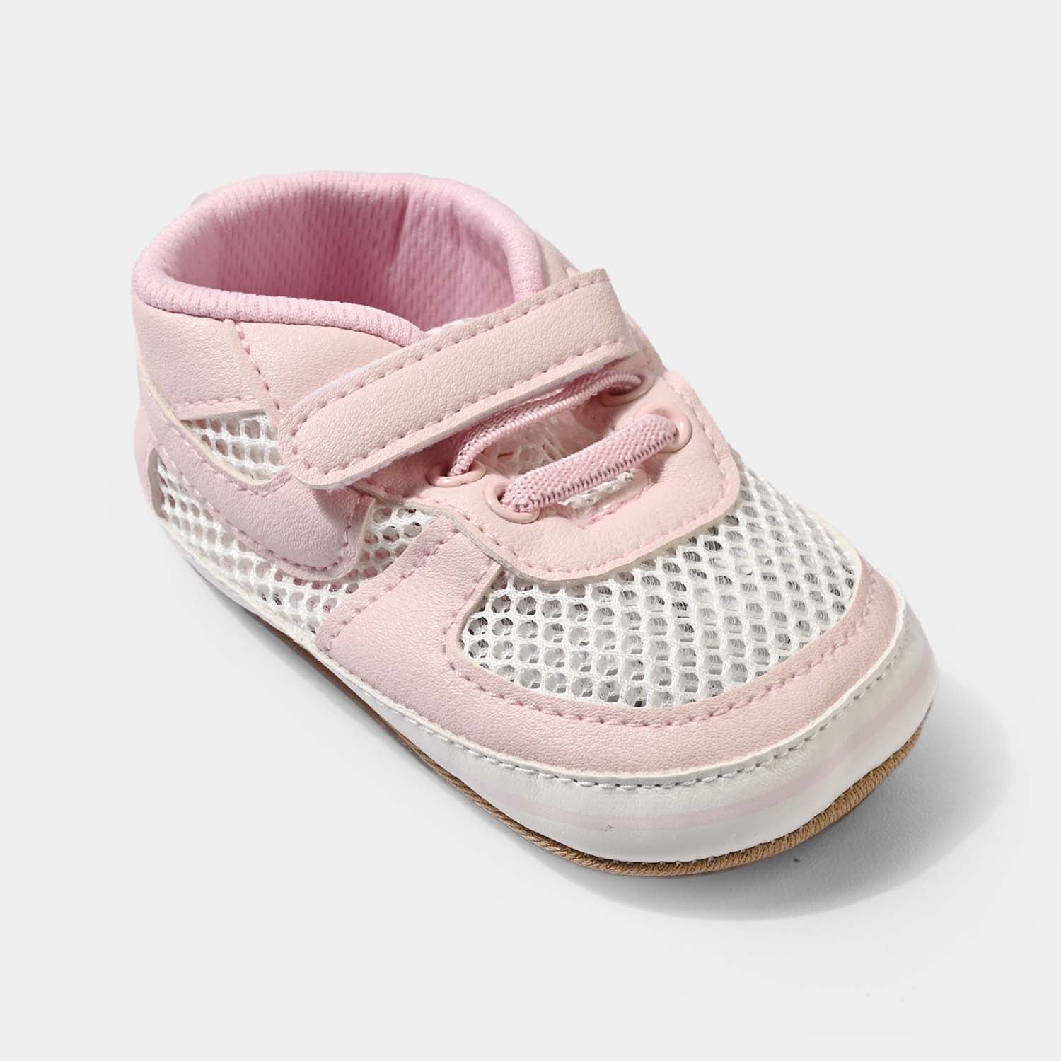 Infant girls’ shoes in pink and white with lace and strap closure for a secure and comfortable fit.