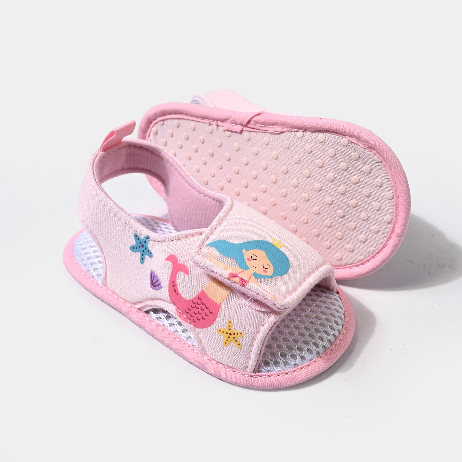 Infant girls’ pink sandals feature mermaid-themed embroidery and a top strap for a secure, easy, and comfortable fit.