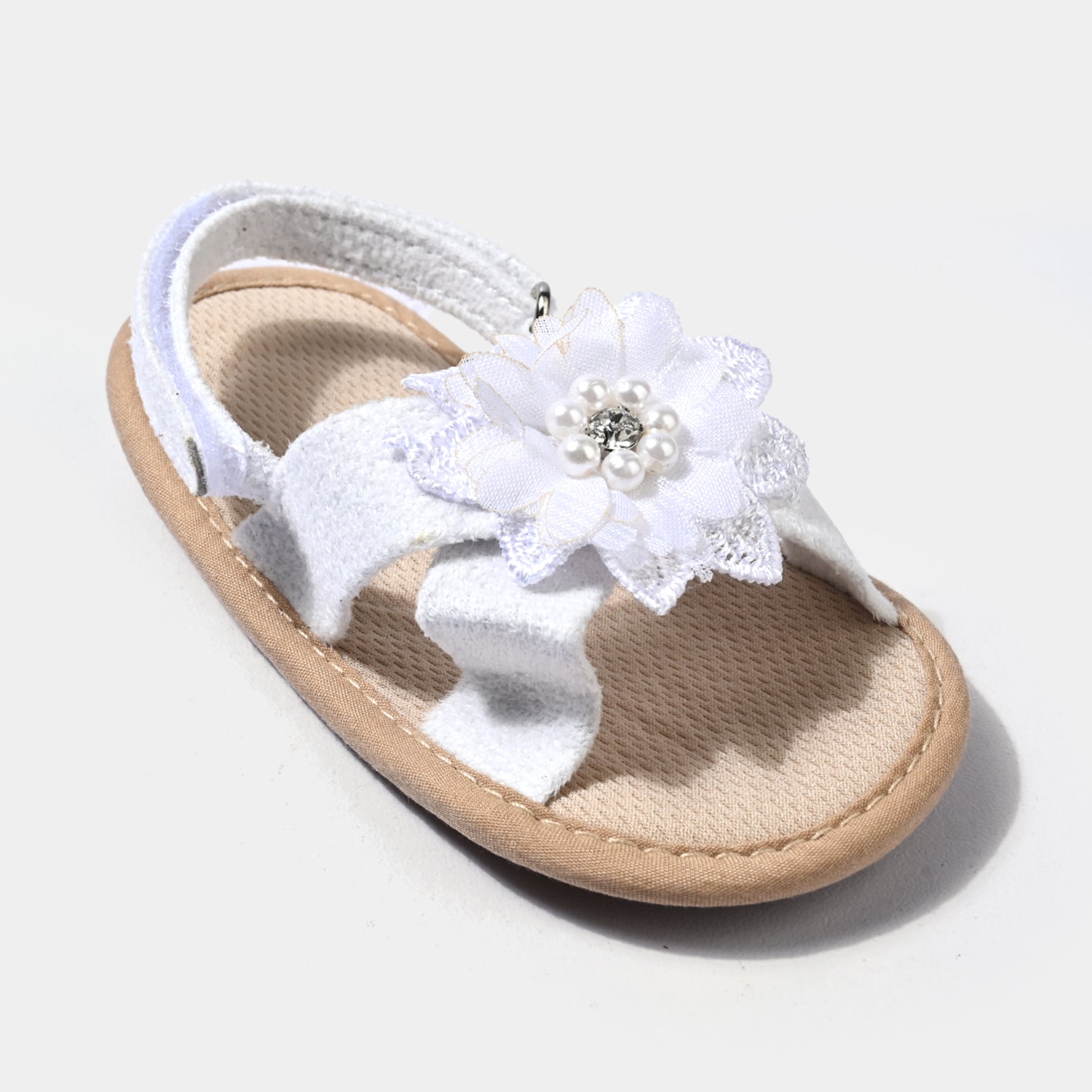 Infant girls’ white sandals feature a cross-style design with floral and pearl embellishments and an elastic back strap for a perfect, comfortable fit.