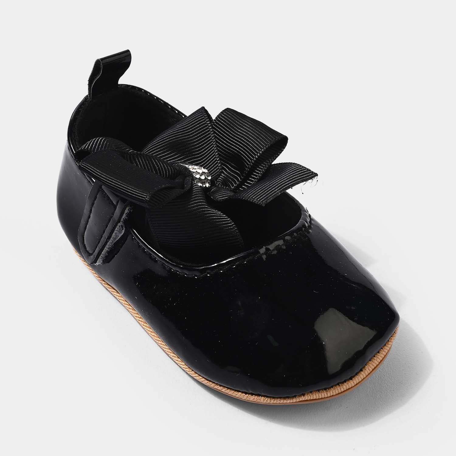Infant girls’ black pumps with a strap and bow on top, perfect for adding a sparkling touch to any outfit.