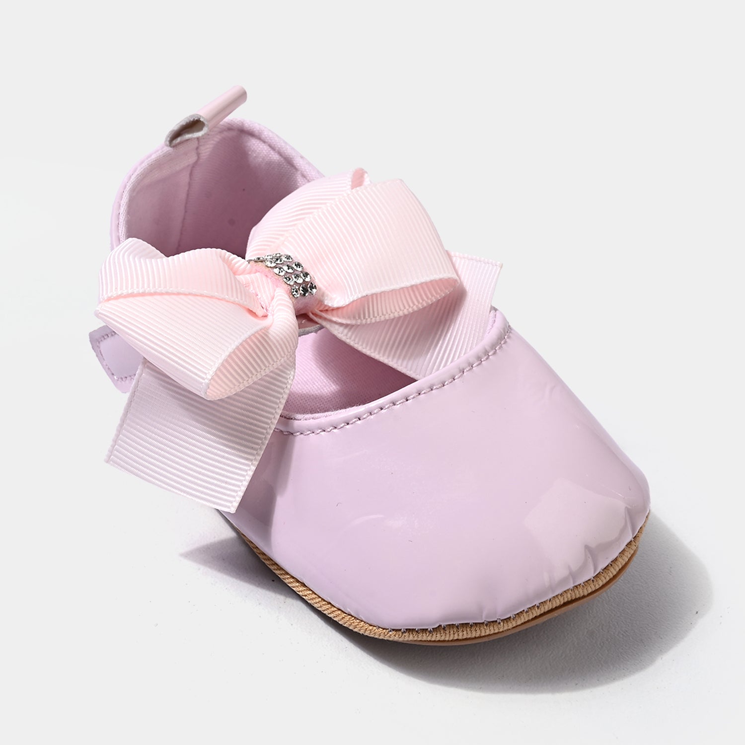 Infant girls’ pink pumps with a strap and bow on top, perfect for adding a sparkling touch to any outfit.