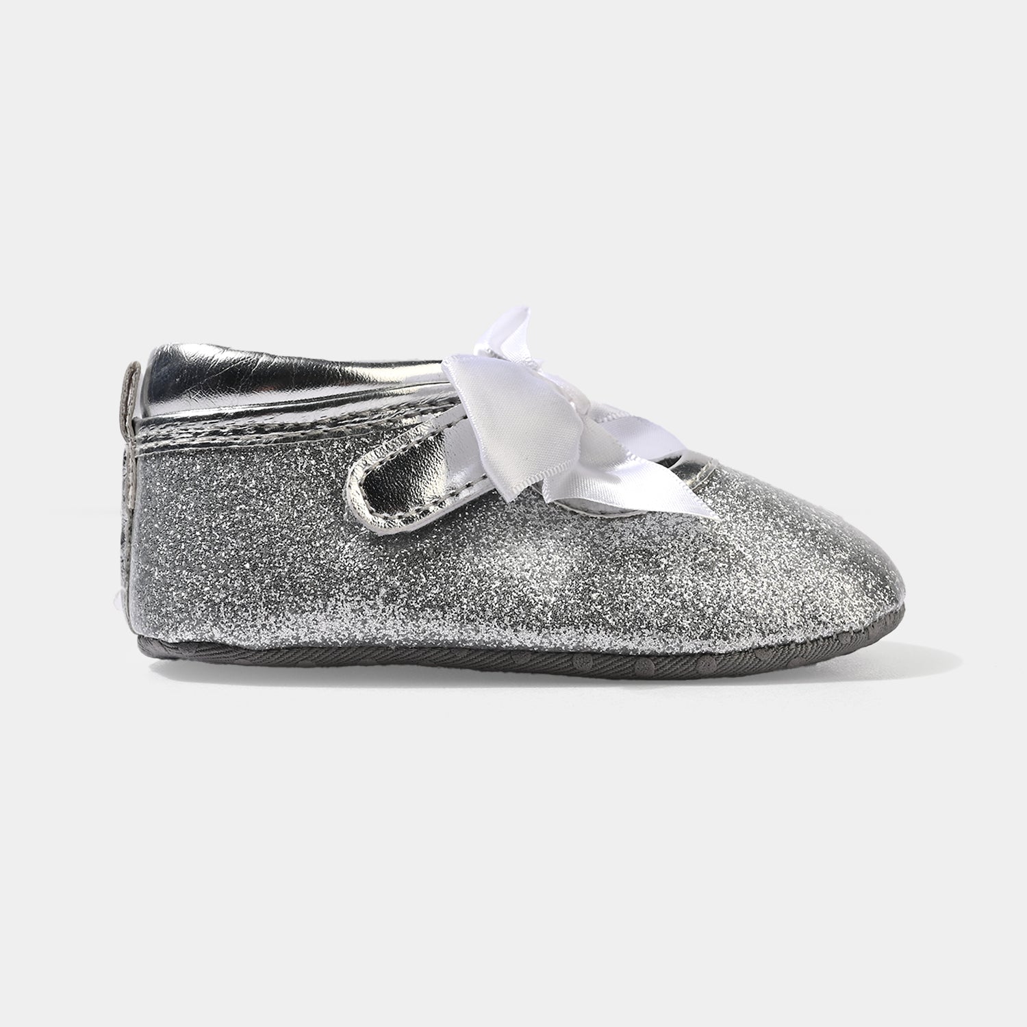 Infant girls’ glittery grey pumps with a bow, perfect for adding a touch of sparkle to any outfit.