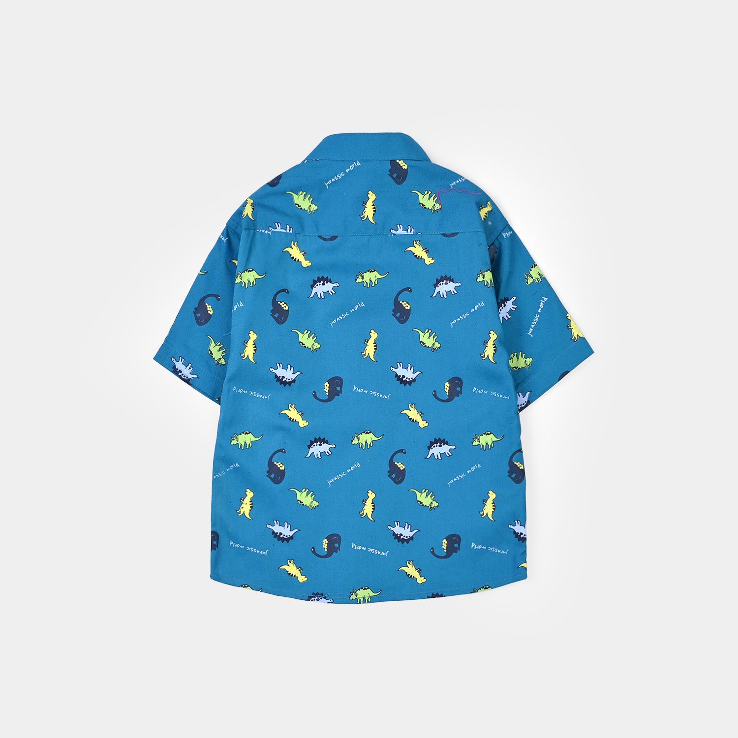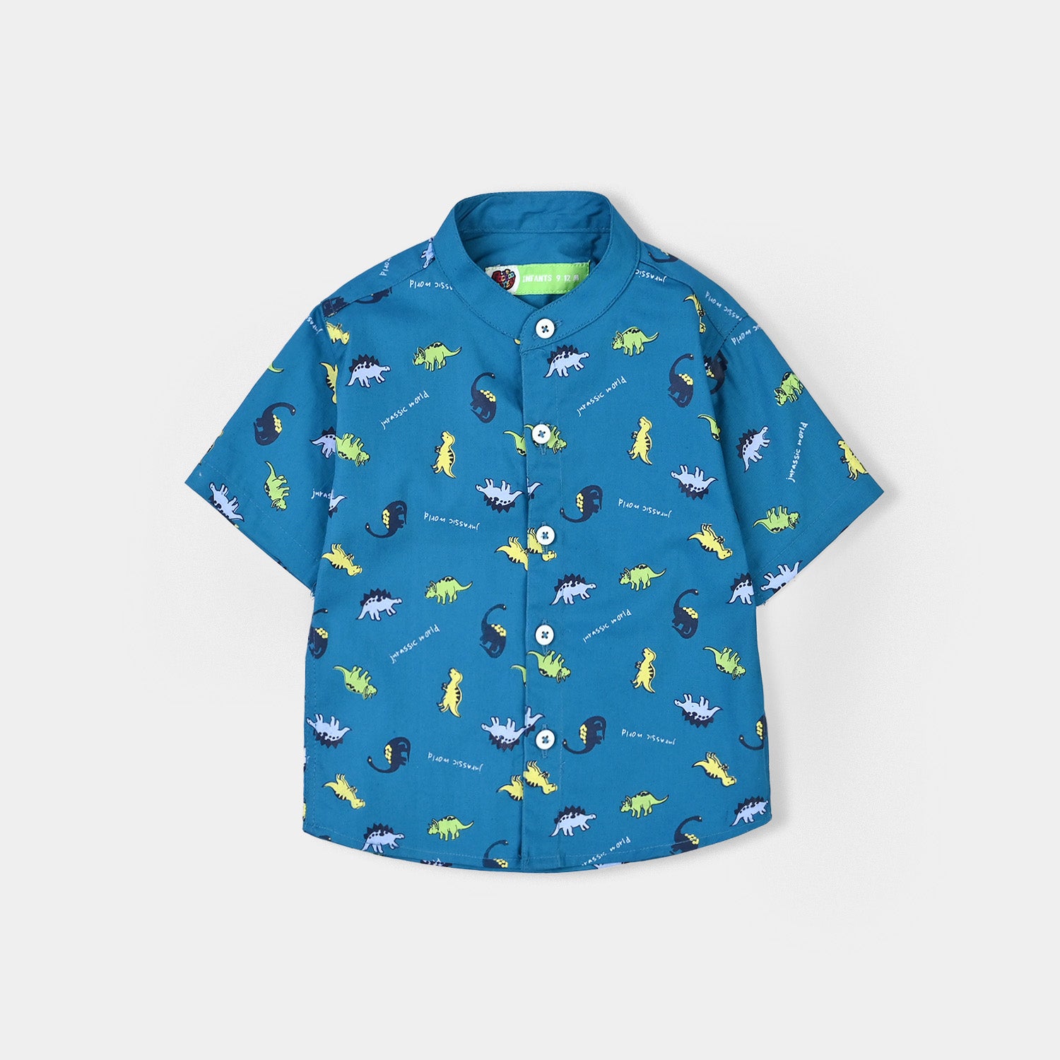 Infant boys’ blue cotton poplin shirt with dinosaur print, featuring a short collar, half sleeves, and front opening, easy to pair with any bottom for a complete look.