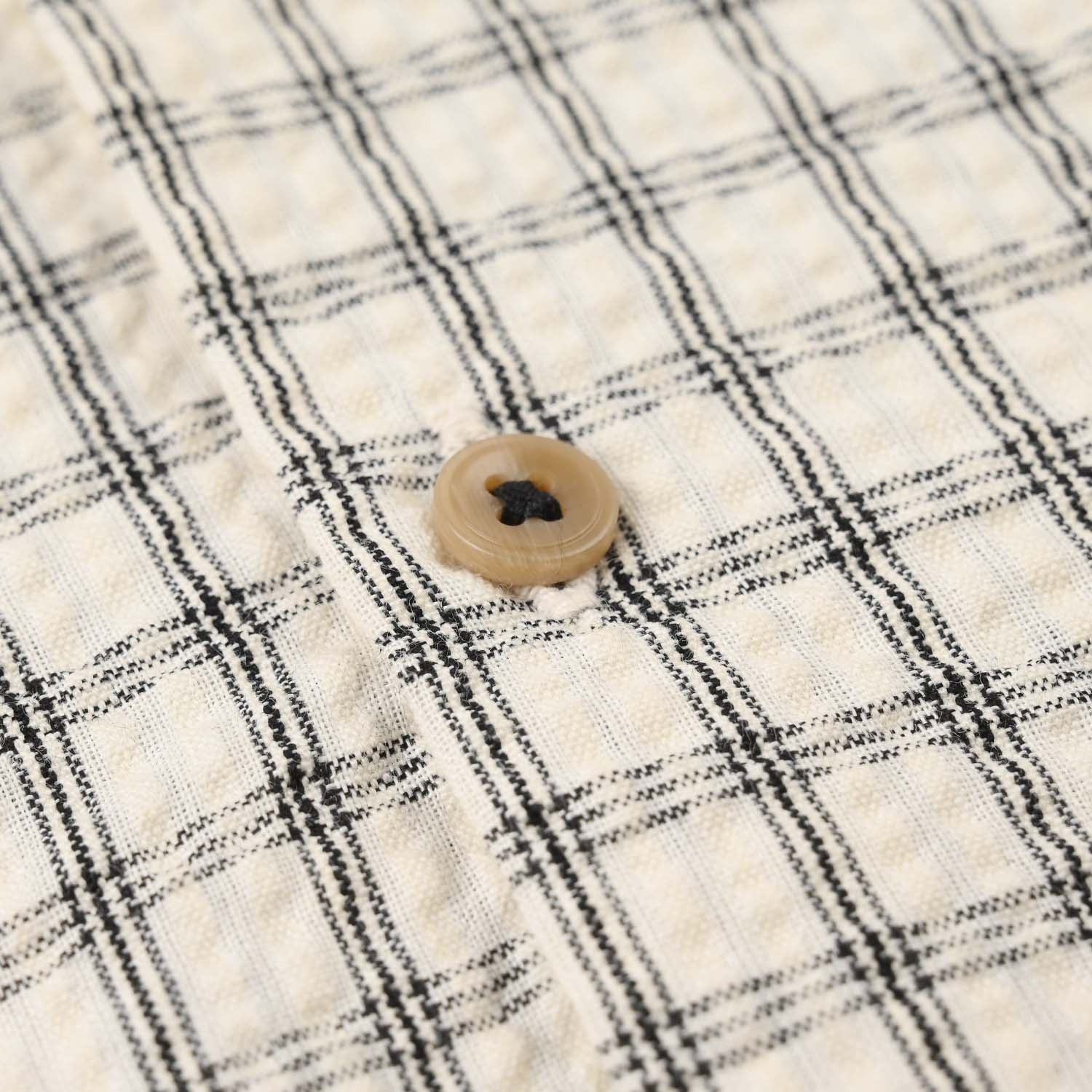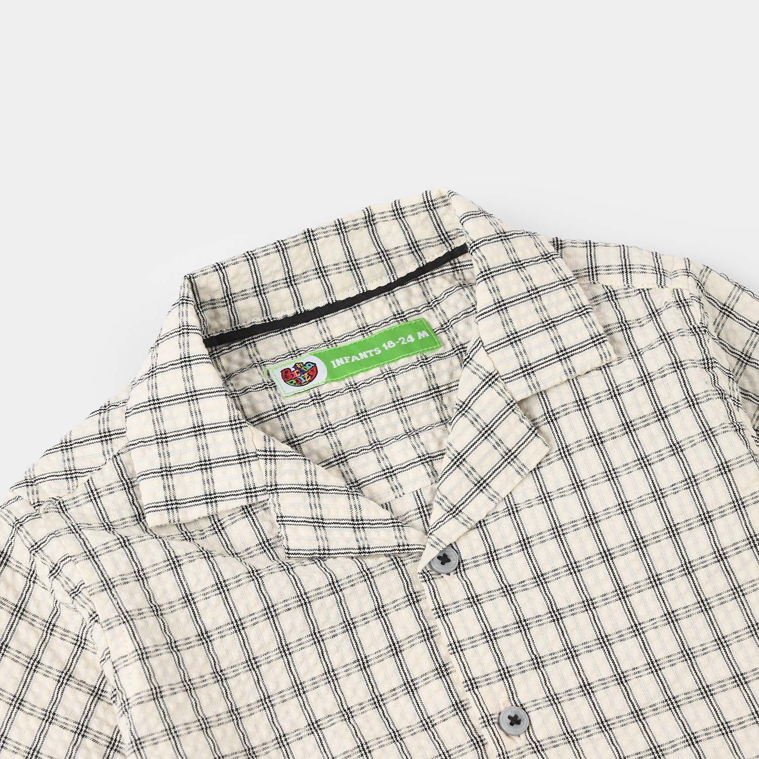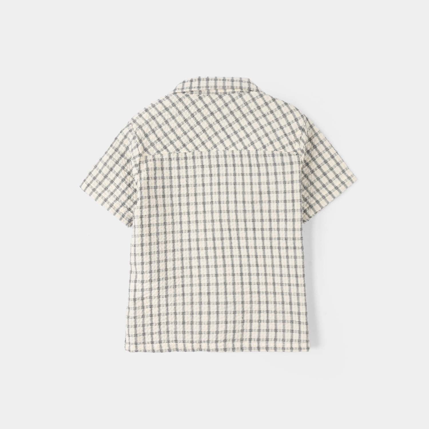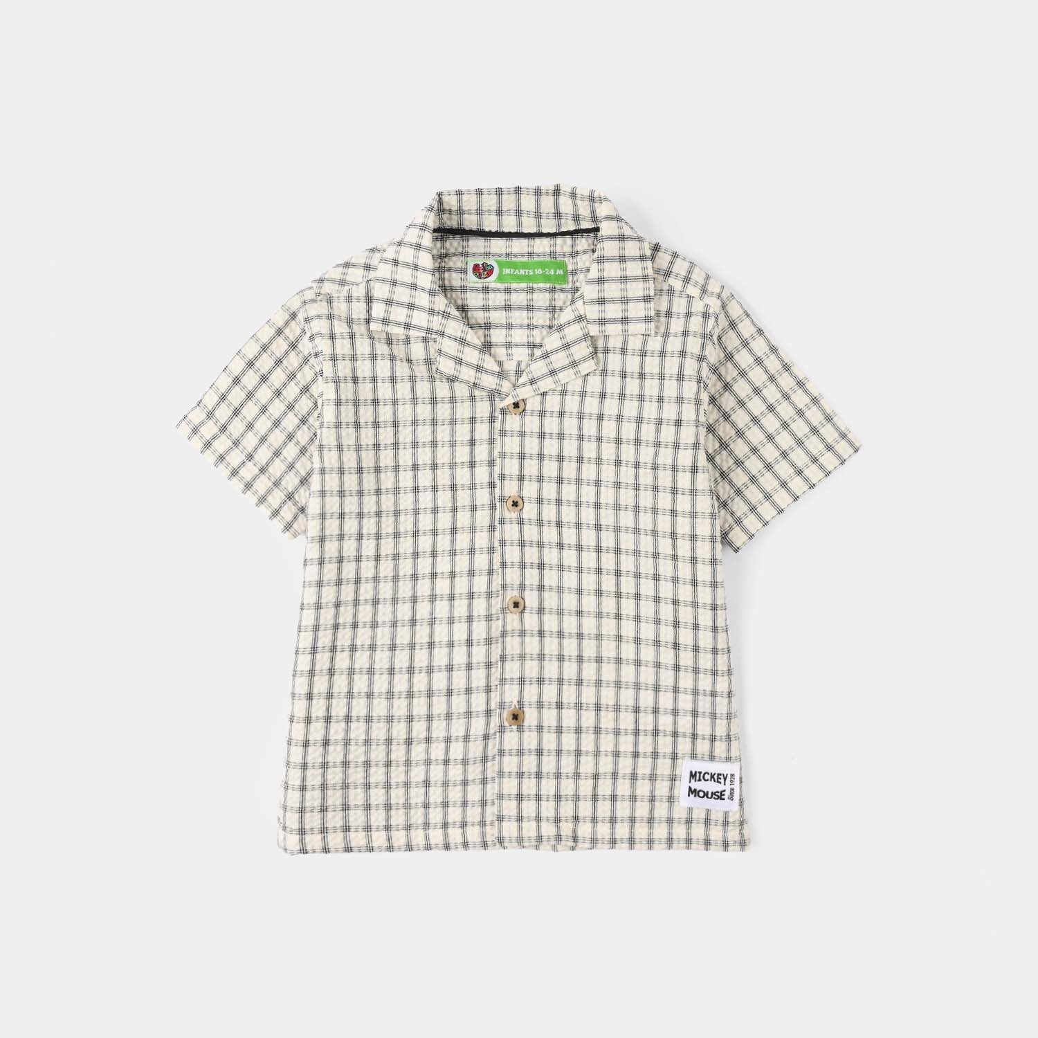 Infant boys’ yarn-dyed shirt in white, featuring a collar, front opening, half sleeves, and a checkered Mickey Mouse text print.