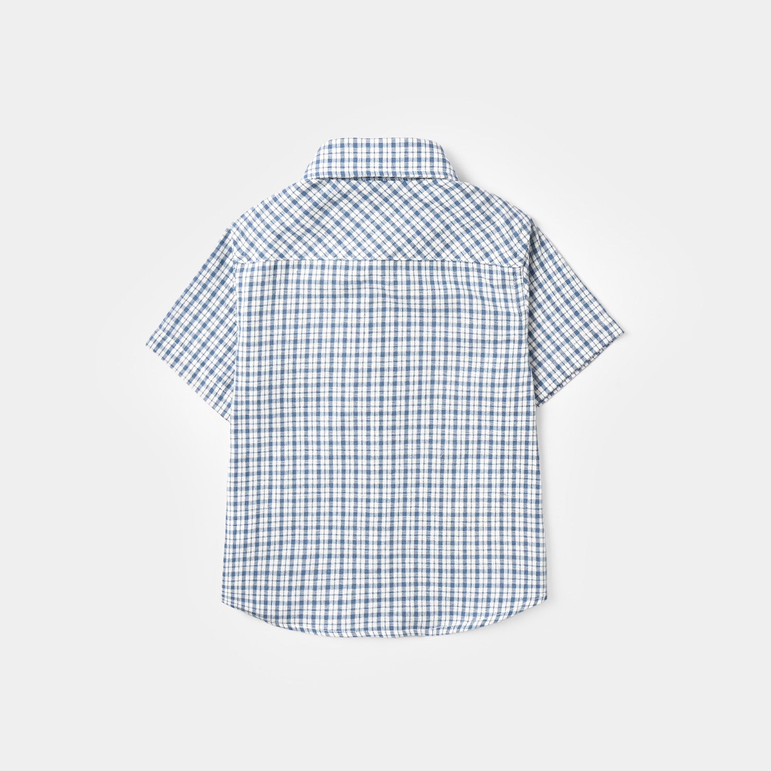 Infant boys’ yarn-dyed shirt in blue with a front button-down, half sleeves, rounded hem, checkered print, front pocket, and Monster Team character embroidery.