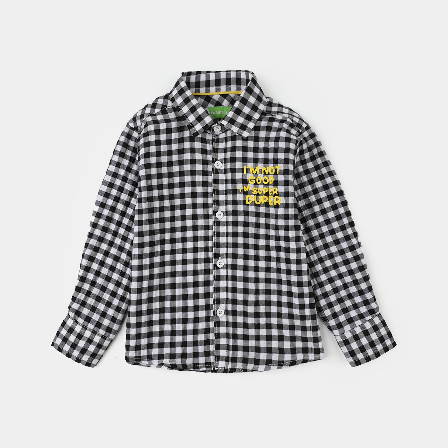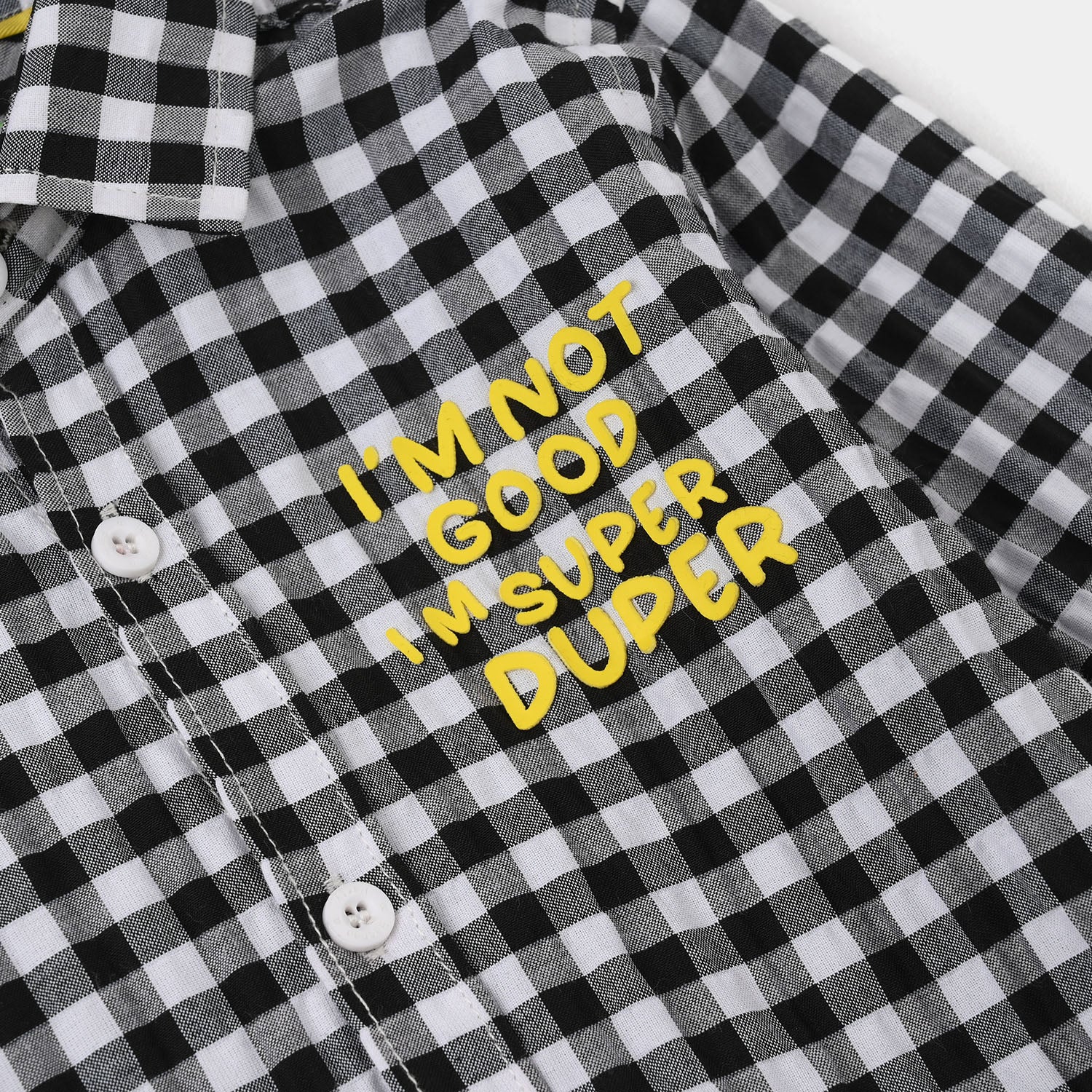 Infant boys black check yarn-dyed button-down shirt featuring a classic collar, cuffed sleeves, and front text detailing, perfect for a smart and trendy everyday look.