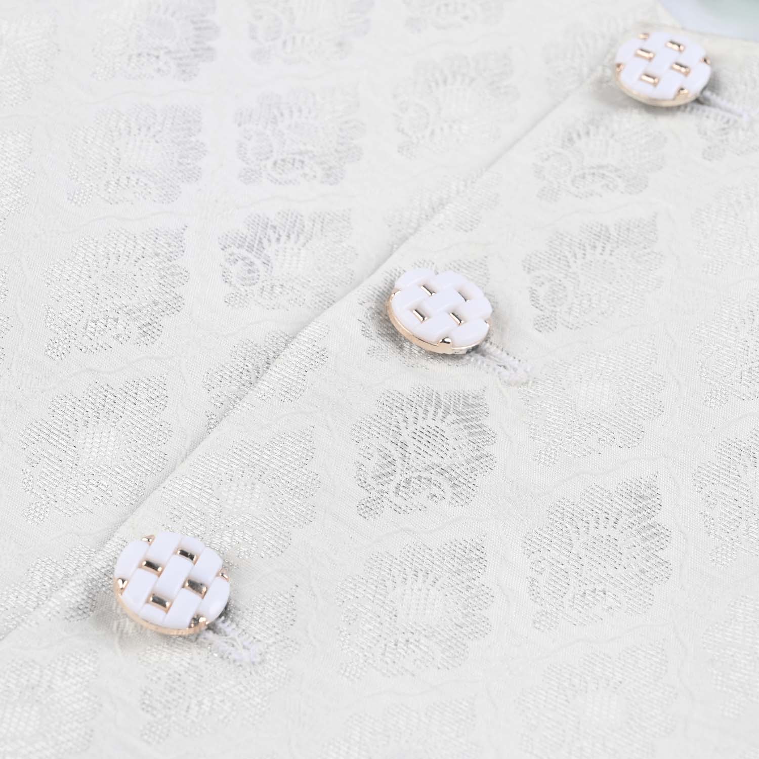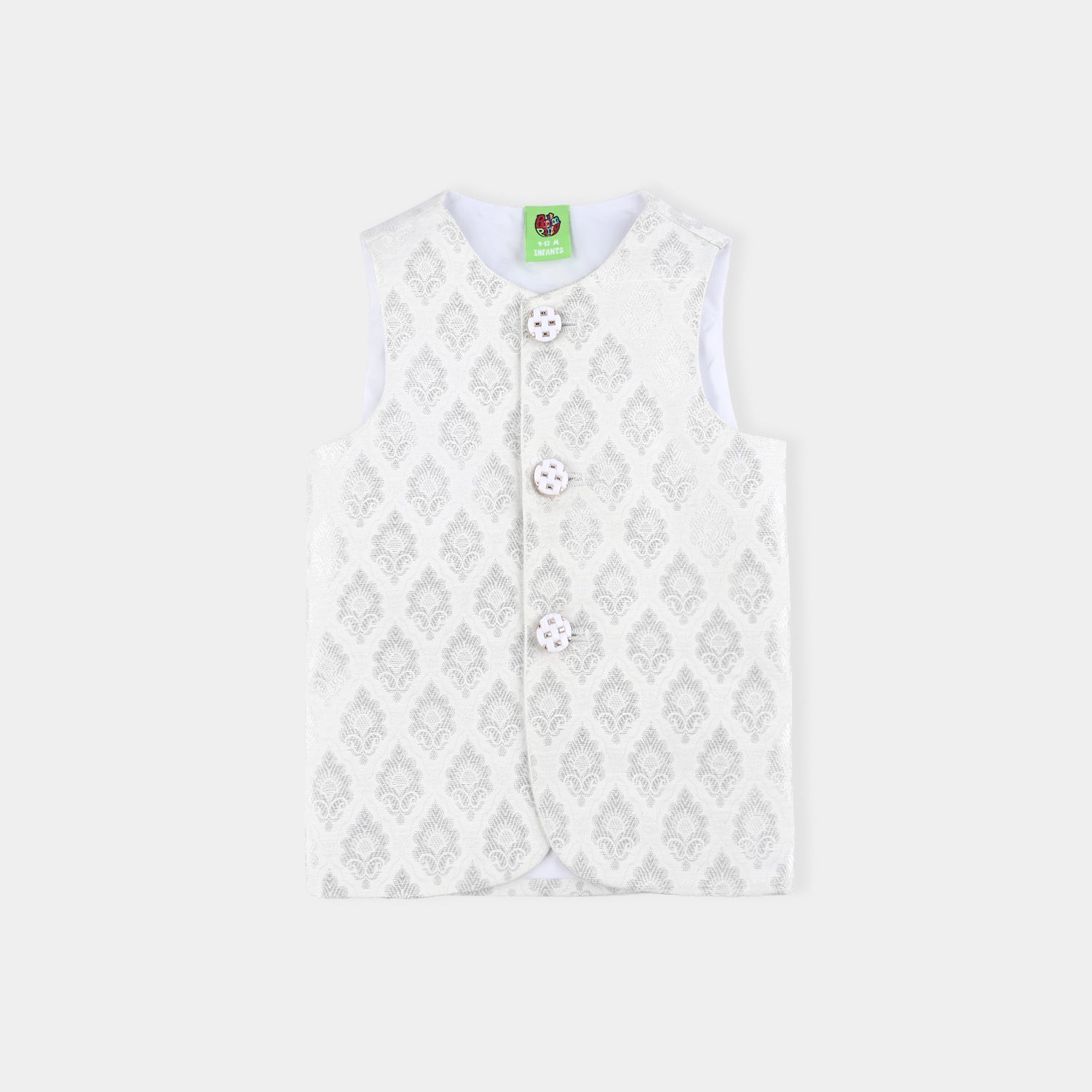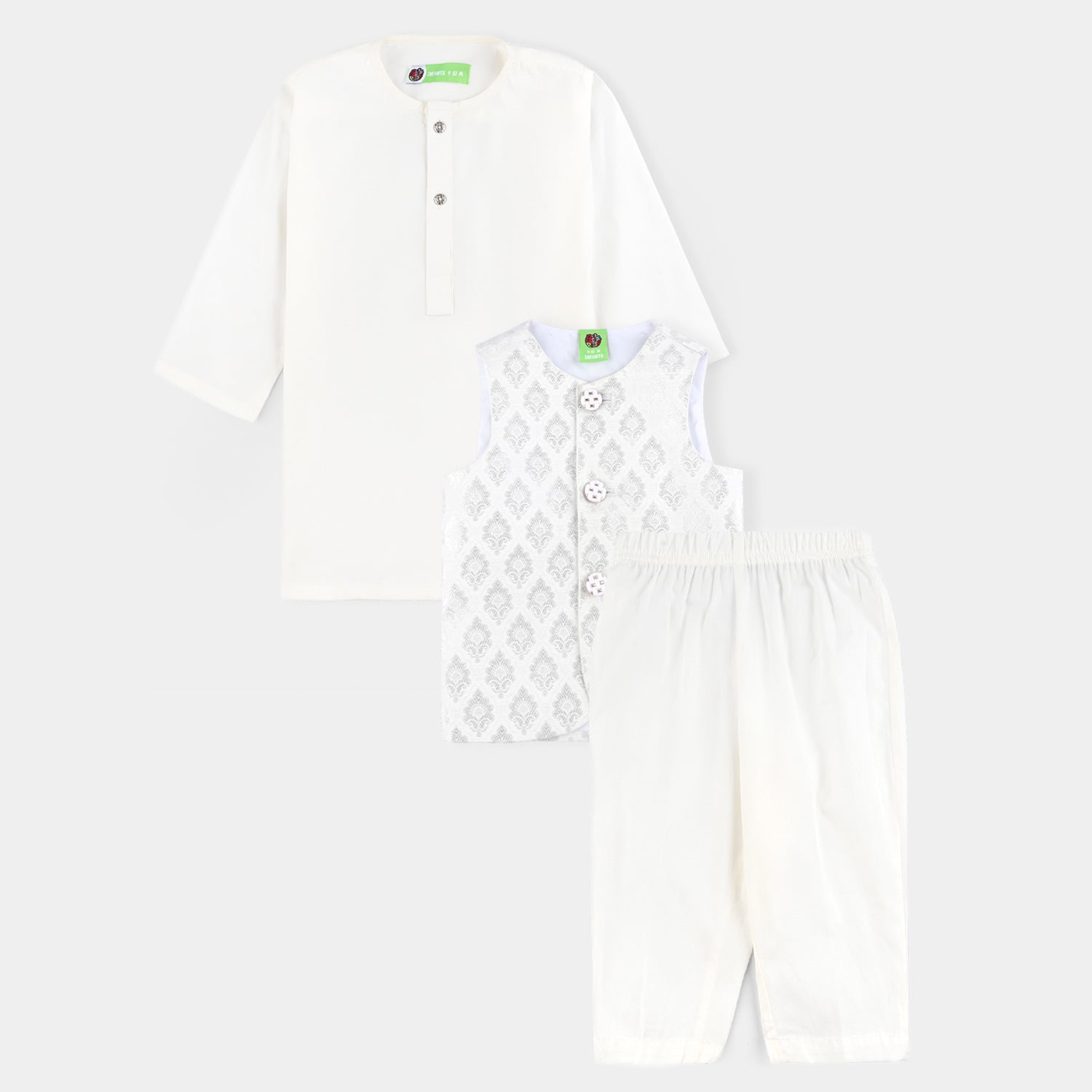 Traditional meets refined style with this kurta-pajama set, complemented by a sophisticated waistcoat, which is crafted for festive occasions.