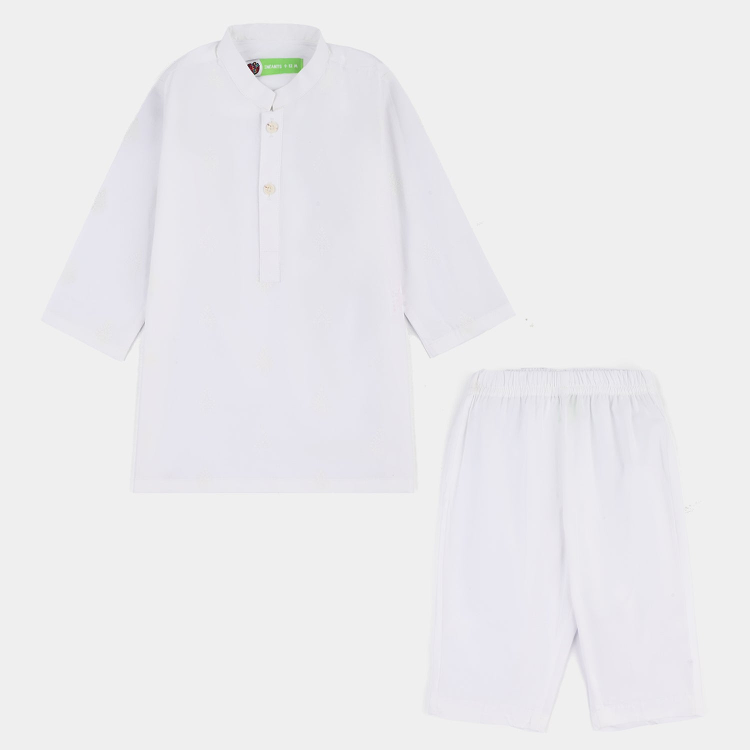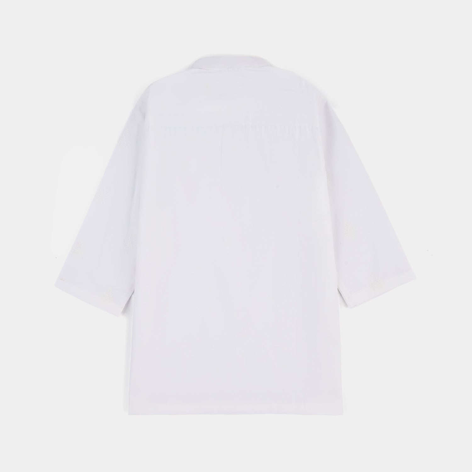 Boys white cotton kurta pajama features a sherwani collar and embossed pattern, offering a classic and elegant traditional look.