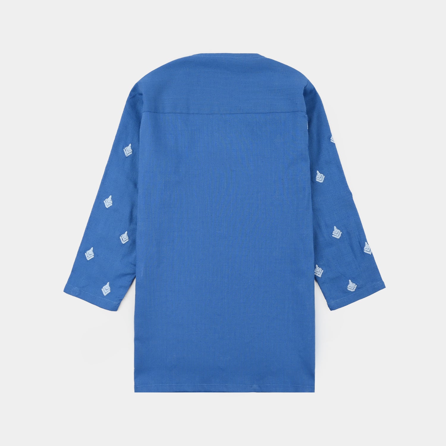 Infant boys’ cotton slub embroidered kurta in blue, featuring long sleeves and all-over booti embroidery, perfect with white or matching pajama.