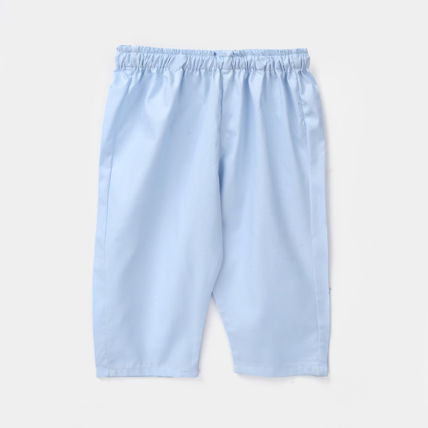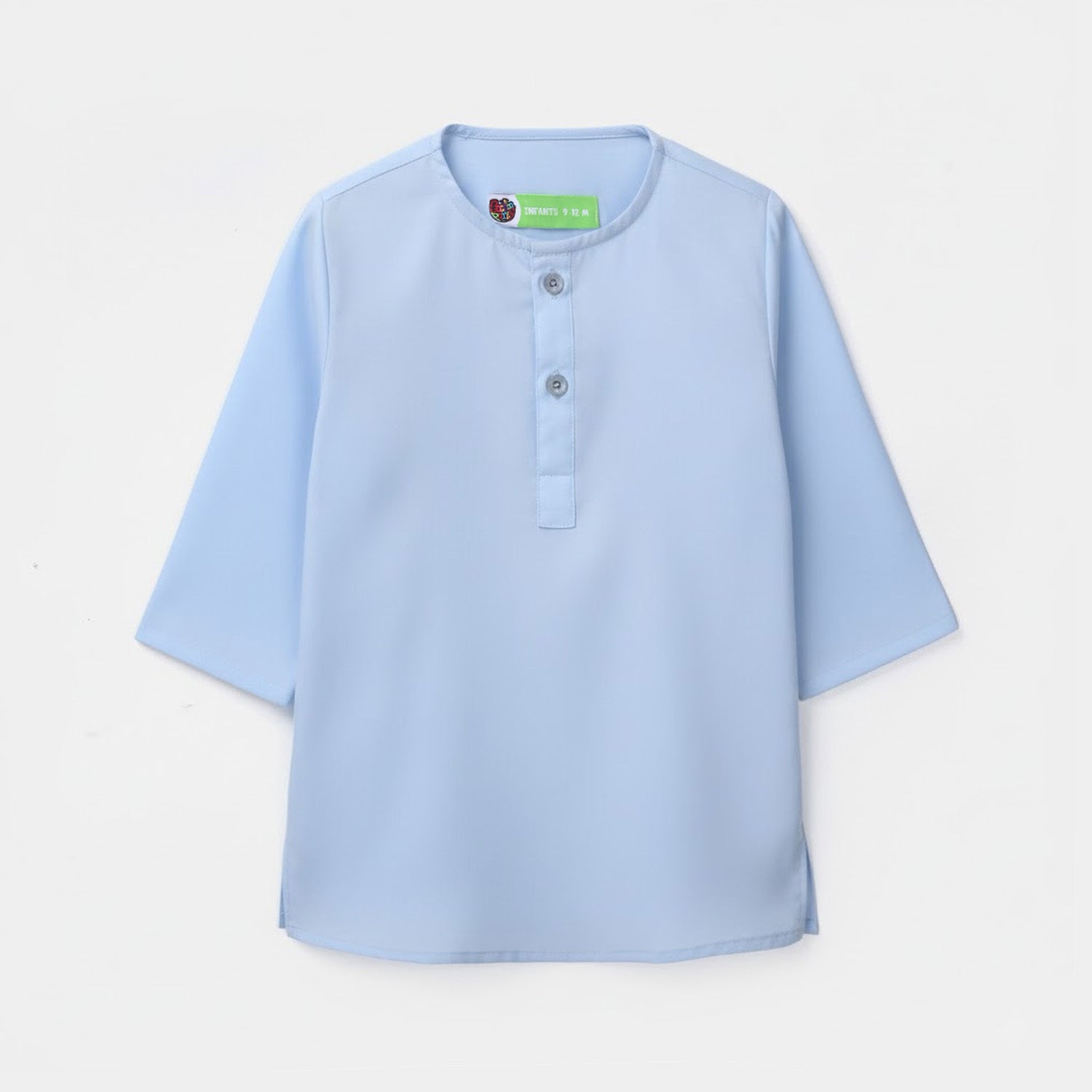 Boys blue kurta pajama featuring a kurta patti and full sleeves, perfect for a classic and comfortable traditional look.