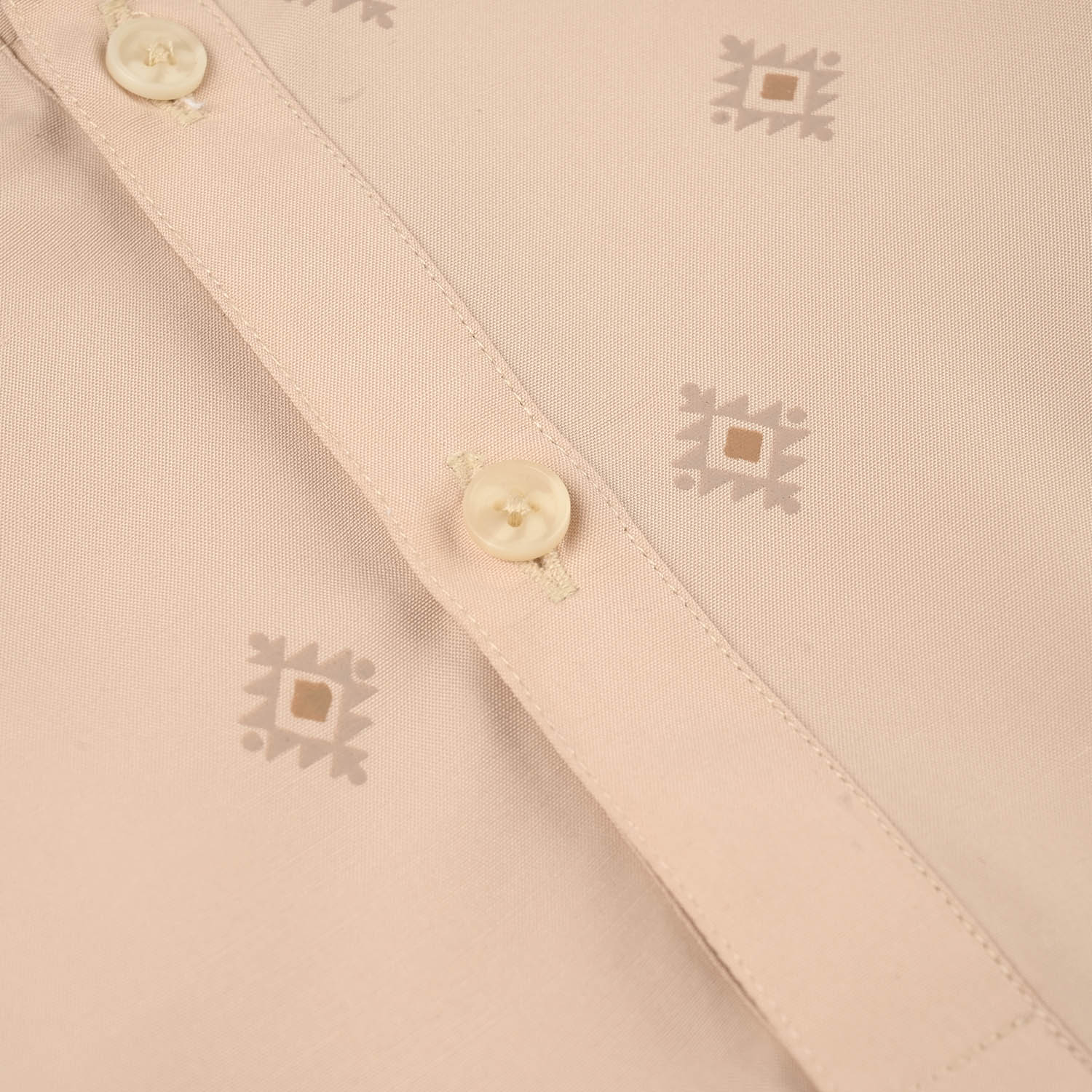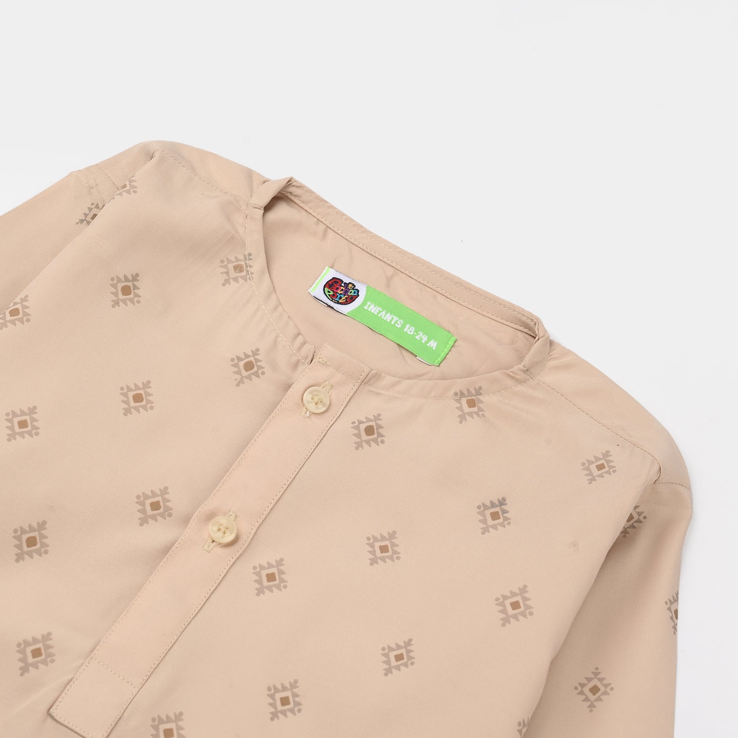 This beige printed boys' poly viscose kurta features a classic sherwani collar and full sleeves, giving your little one a smart traditional look for special occasions.