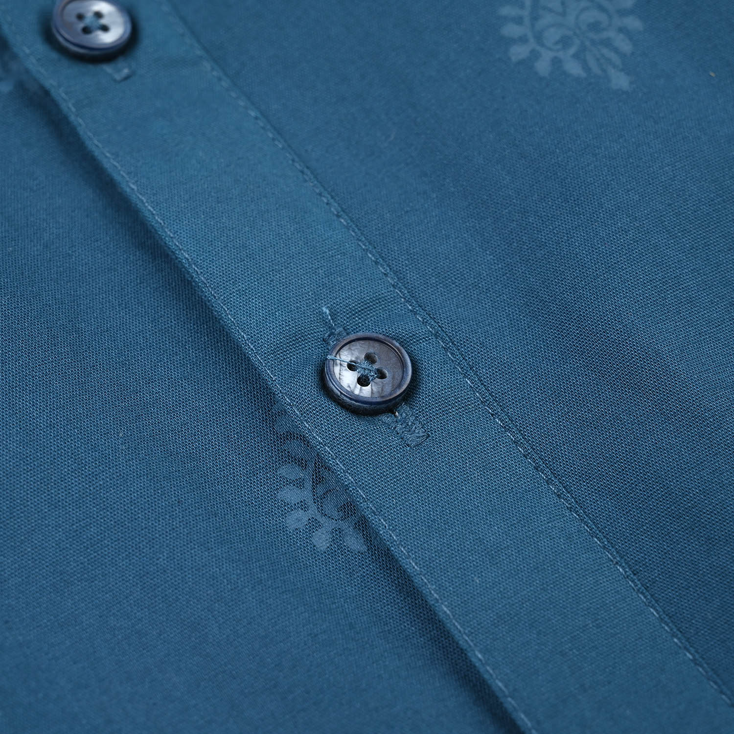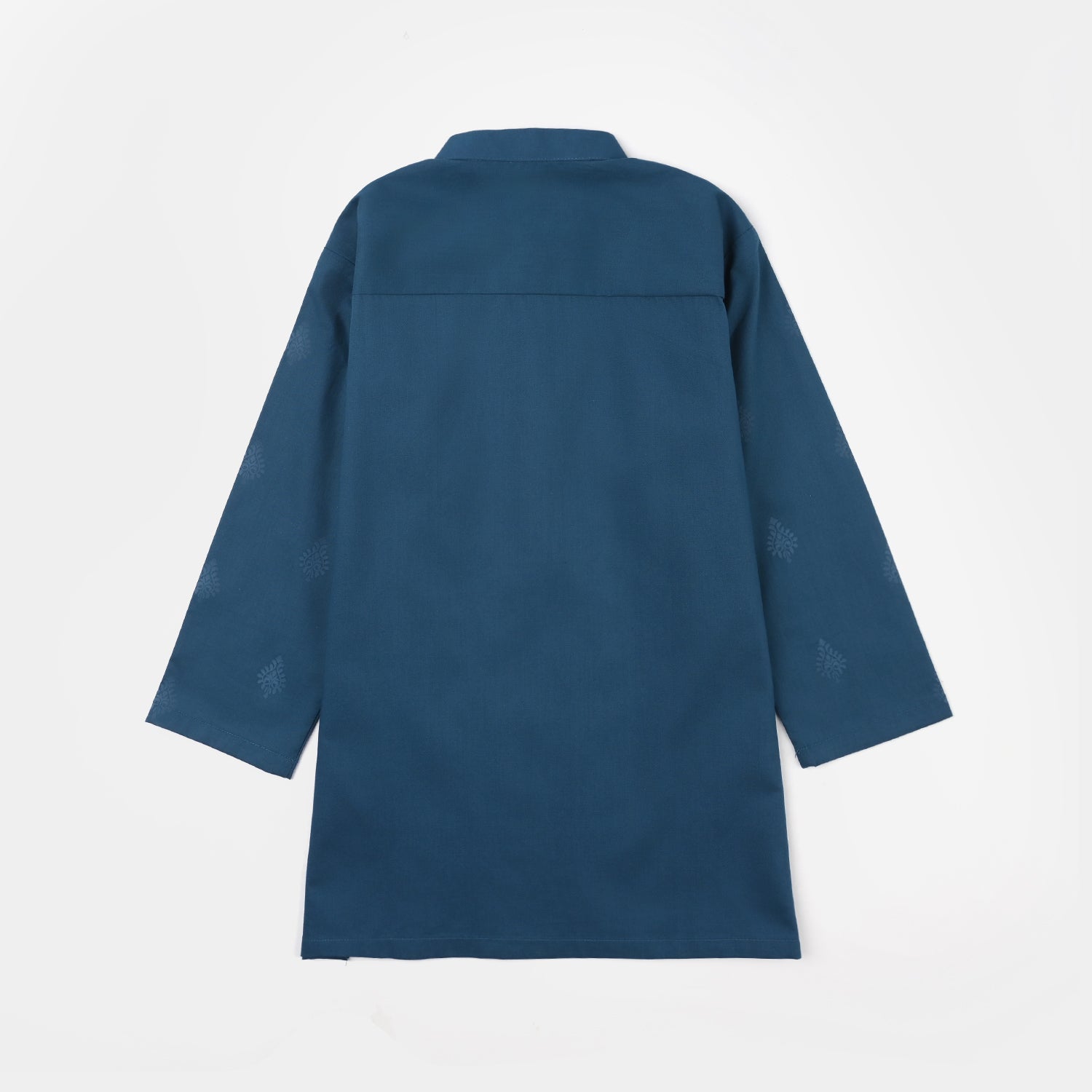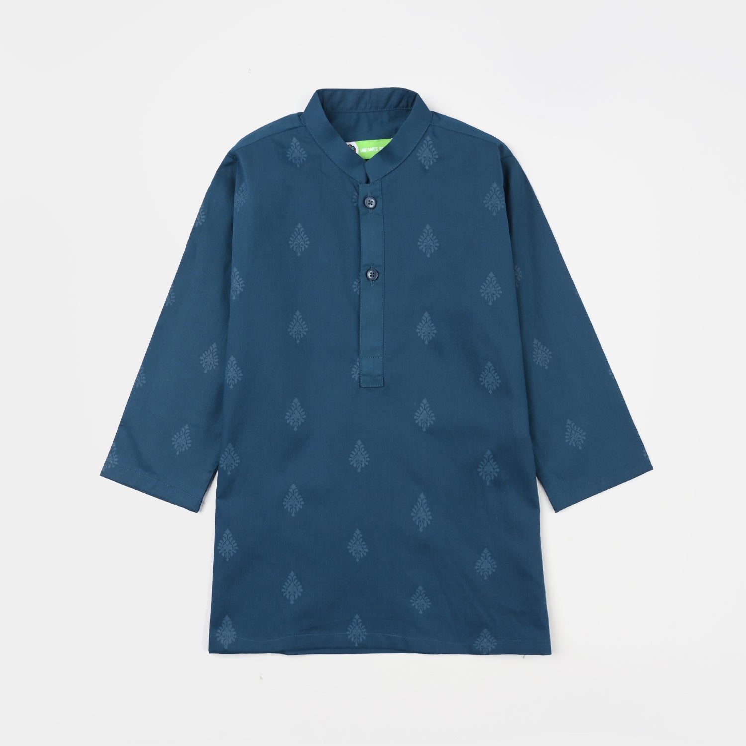 This green printed boys poplin kurta features a classic sherwani collar and full sleeves, giving your little one a smart traditional look for any occasion.